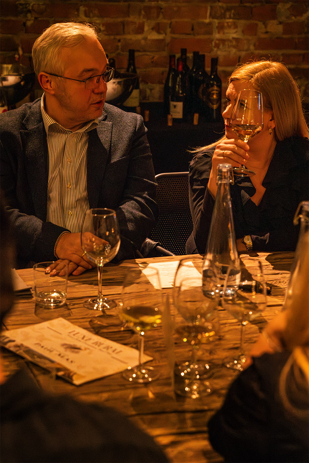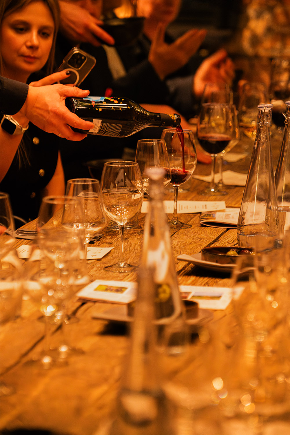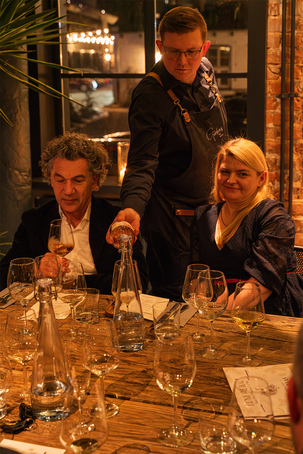 Aperitif przy Prima Perla Crémant Brut otworzył wieczór. W przystawkach krewetka w panko z Picpoul de Pinet, stek z selera z sosem holenderskim z Blanc Languedoc Château, gołąbki z tofu w bulionie shitake dashi z Rosorange. Na dania główne orecchiette z borowikami i Grana Padano przy Astelia Le Petit Prince 2023 oraz polędwica wołowa z Château Clos des Mures. Wieczór zamknęła tarta z gorzkiej czekolady z Île de Conas Marsellan.