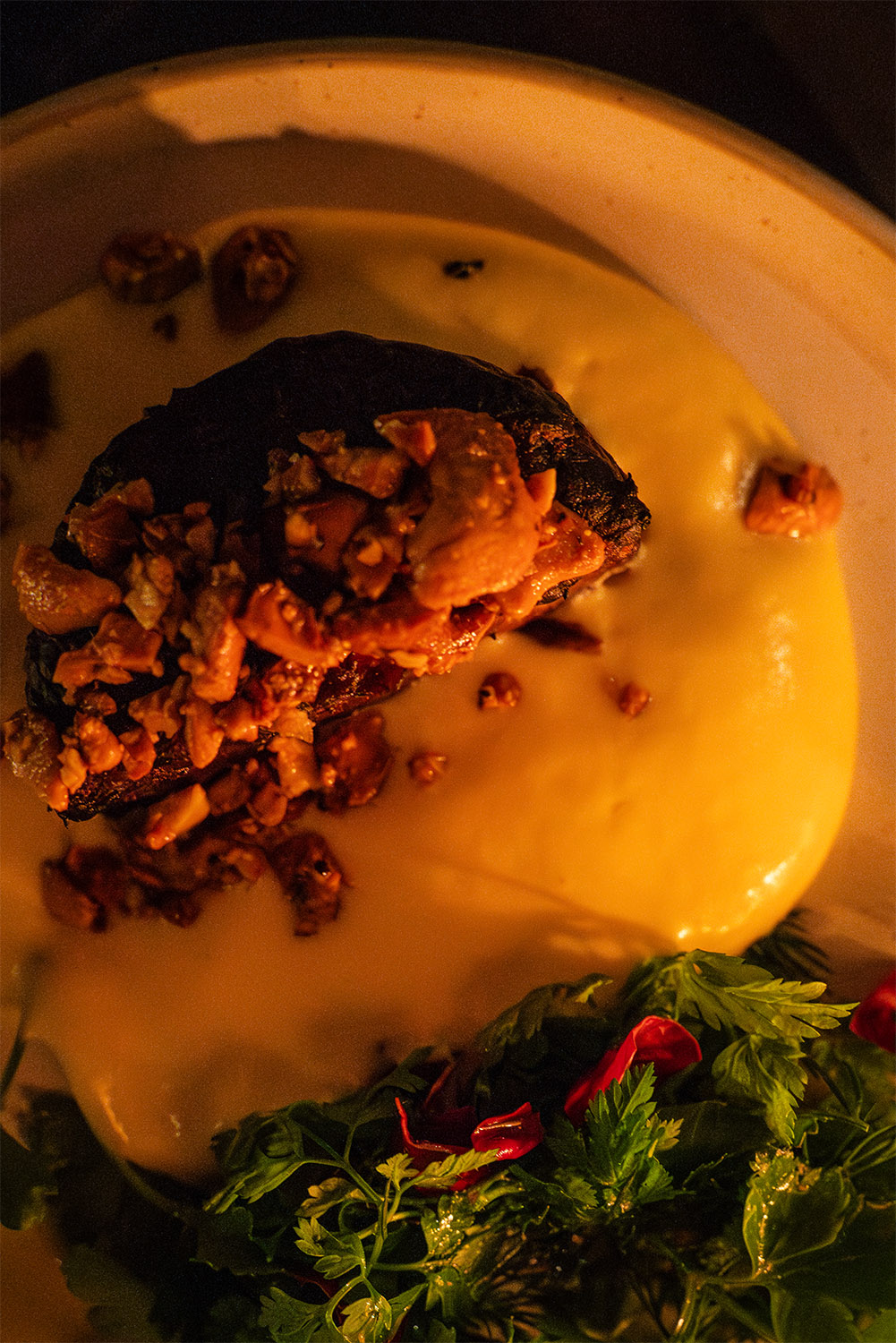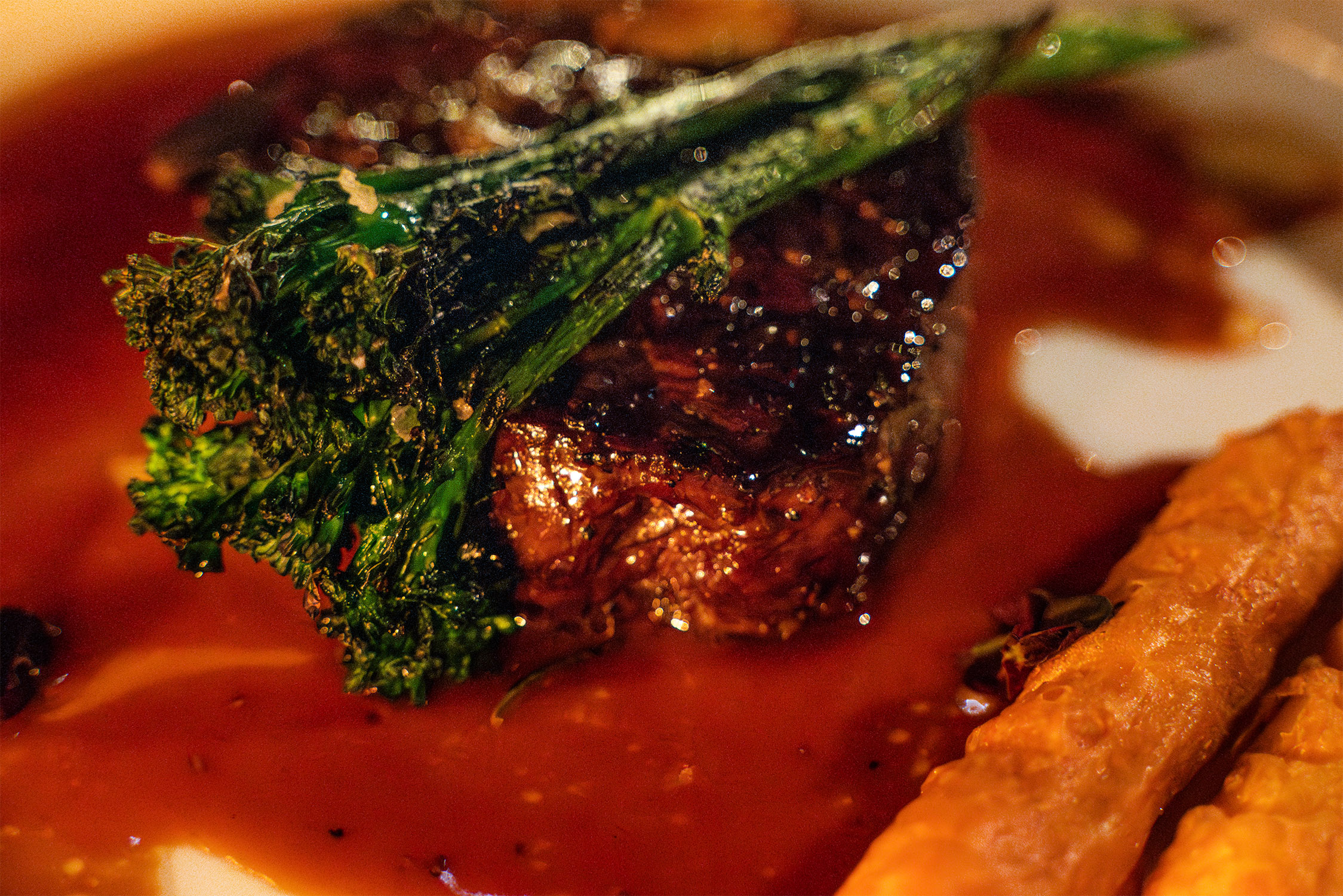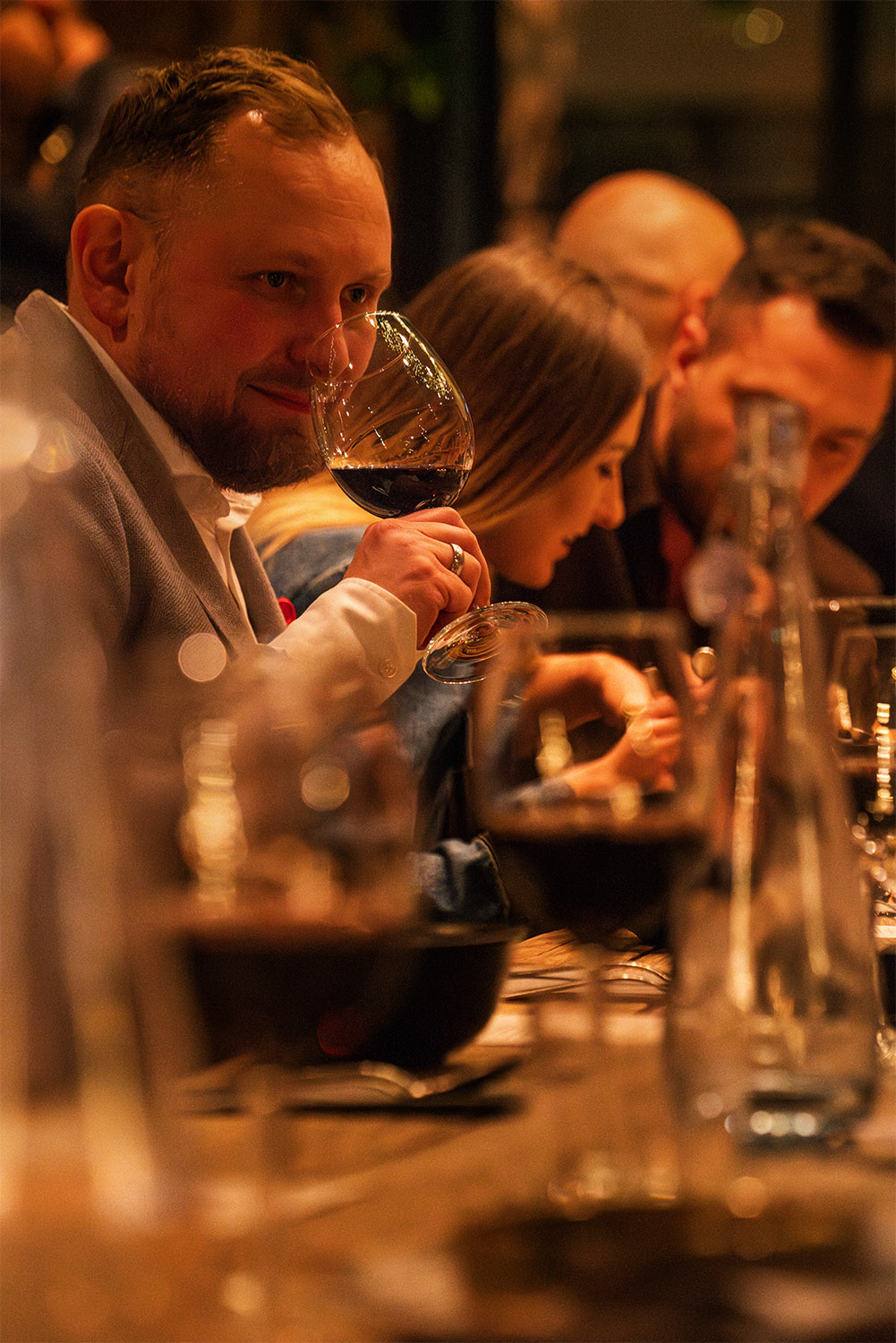 Aperitif przy Prima Perla Crémant Brut otworzył wieczór. W przystawkach krewetka w panko z Picpoul de Pinet, stek z selera z sosem holenderskim z Blanc Languedoc Château, gołąbki z tofu w bulionie shitake dashi z Rosorange. Na dania główne orecchiette z borowikami i Grana Padano przy Astelia Le Petit Prince 2023 oraz polędwica wołowa z Château Clos des Mures. Wieczór zamknęła tarta z gorzkiej czekolady z Île de Conas Marsellan.