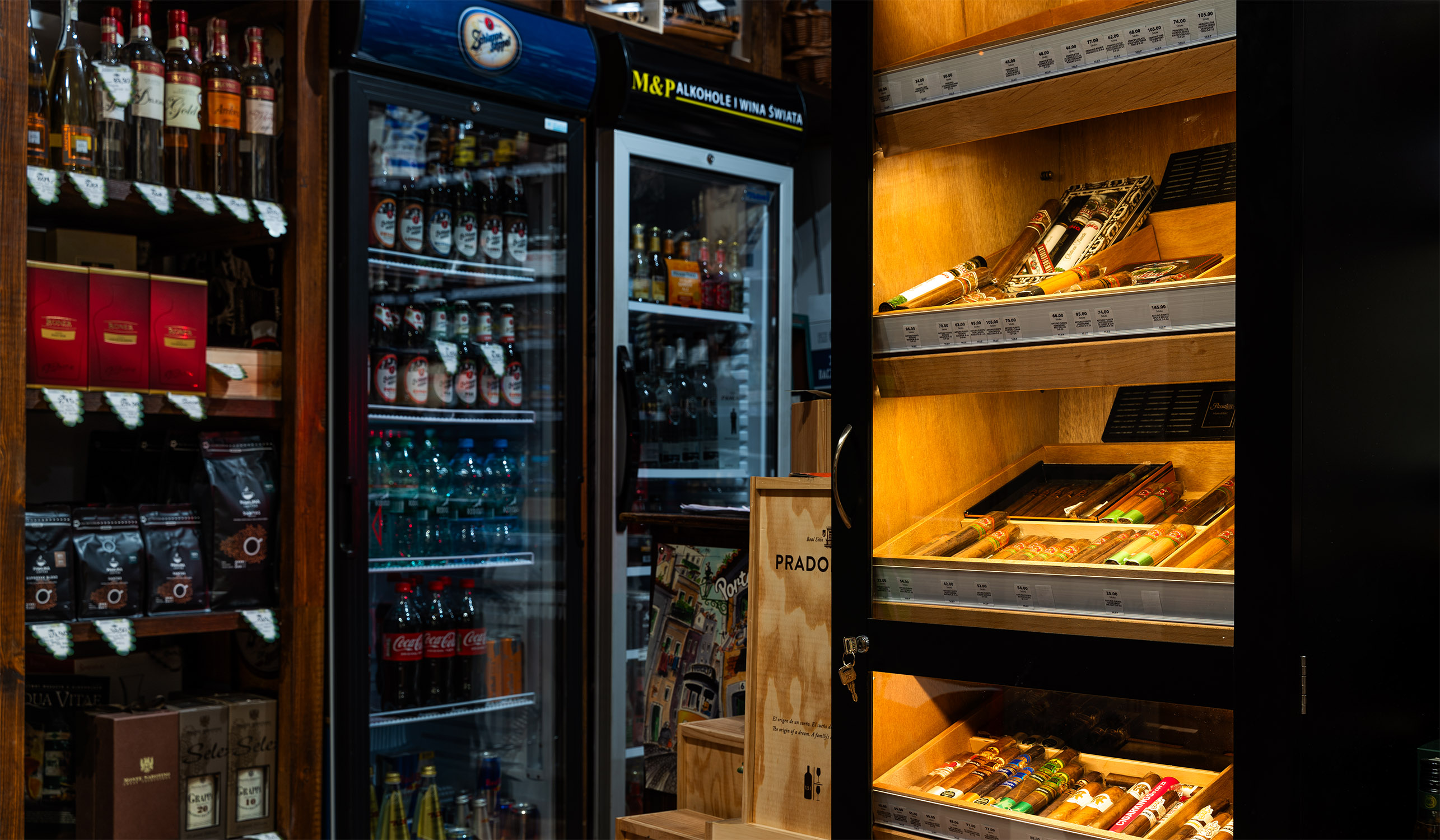 W środku humidor z cygarami i sala degustacyjna. Degustacje odbywają się co najmniej raz w miesiącu. W salonie obsłuży cię zespół wyszkolonych doradców, a wśród nich dwie osoby posiadające certyfikaty WSET 2, więc możesz liczyć na fachowe doradztwo przy każdej wizycie.