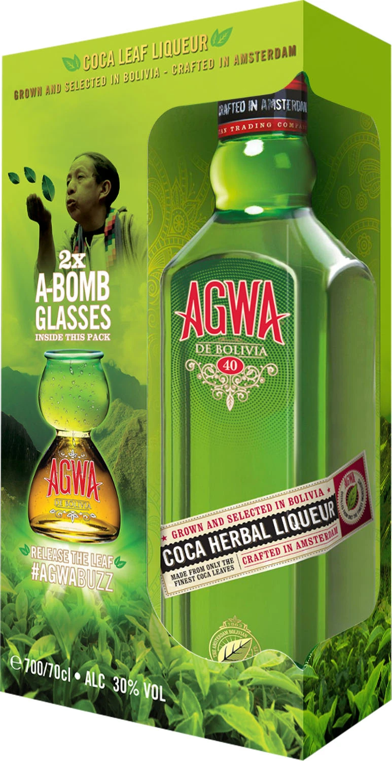 AGWA DE BOLIVIA - kultowy, pierwszy na świecie likier ziołowy na bazie starannie wyselekcjonowanych liści boliwijskiej koki trzykrotnie destylowany o finalnej mocy 30% alkoholu. Połączony z unikalną mieszanką 36 aromatycznych naturalnych ziół m.in. guaraną, zieloną herbatą oraz wyciągiem z żeń-szenia stymuluje i wyostrza zmysły, pobudza oraz dodaje energii. Intrygujący zielony kolor likieru podkreśla jego wyrazisty charakter, a pieprzny posmak z akcentami liści tytoniu, eukaliptusa, liści laurowych i mięty zwiększa wrażenia. Intensywniejsze doznania gwarantuje w połączeniu z limonką, którą popija się schłodzonym shotem. Podawana na wiele sposobów, najlepiej smakuje w specjalnym kieliszku Agwa Bomb, dostarczając przyjemności dla zmysłów aż do ostatniej kropli.