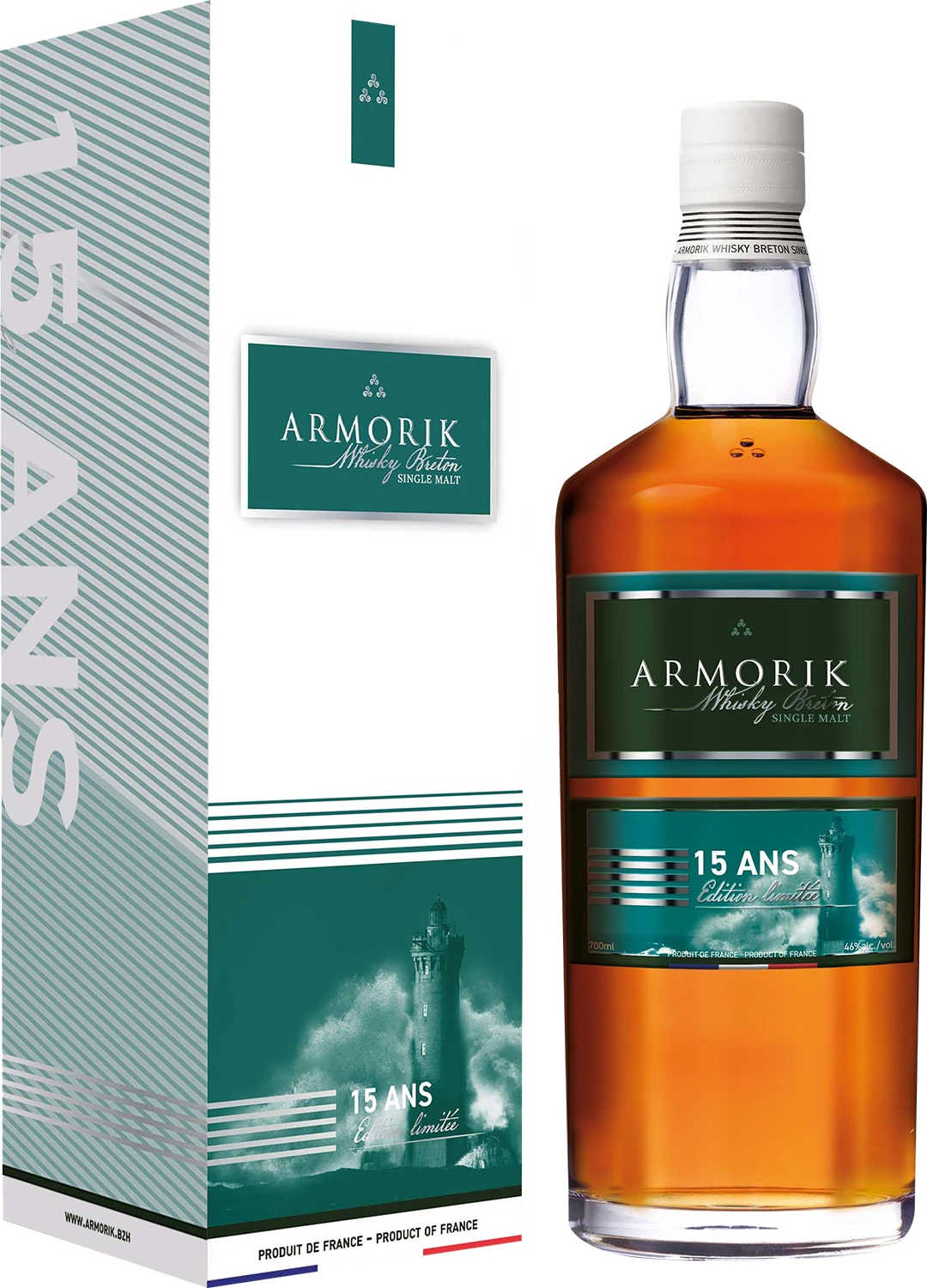 Piętnastoletnia whisky Armorik jest obecnie najstarszą francuską whisky. 9 lat dojrzewania w beczkach po bourbonie, a następnie 6 lat leżakowania w beczkach po sherry Oloroso. Limitowany wypust tylko 1500 butelek rocznie. Jest to drugie butelkowanie w historii destylarni. W barwie bursztynowe, o bogatym nosie mango, marakui, brzoskwini, miodu, karmelu, z akcentami drewna i suszonej moreli z subtelną a nutą torfu. Na podniebieniu słodkie i pikantne. Pierwsze wrażenie jest owocowe, któremu towarzyszy posmak dojrzałej gruszki i banana. Następnie ewoluuje w kierunku słodkich akcentów miodowych z pikantnymi nutami goździków i cynamonu na finiszu z lekko dymnymi nutami. Kończy się słodką nutą dżemu brzoskwiniowego. Wraz z wiekiem Armorik 15yo nabrał swego rodzaju elegancji i aromatycznej pełni, zachowując jednocześnie charakterystyczną dla destylarni owocową świeżość.