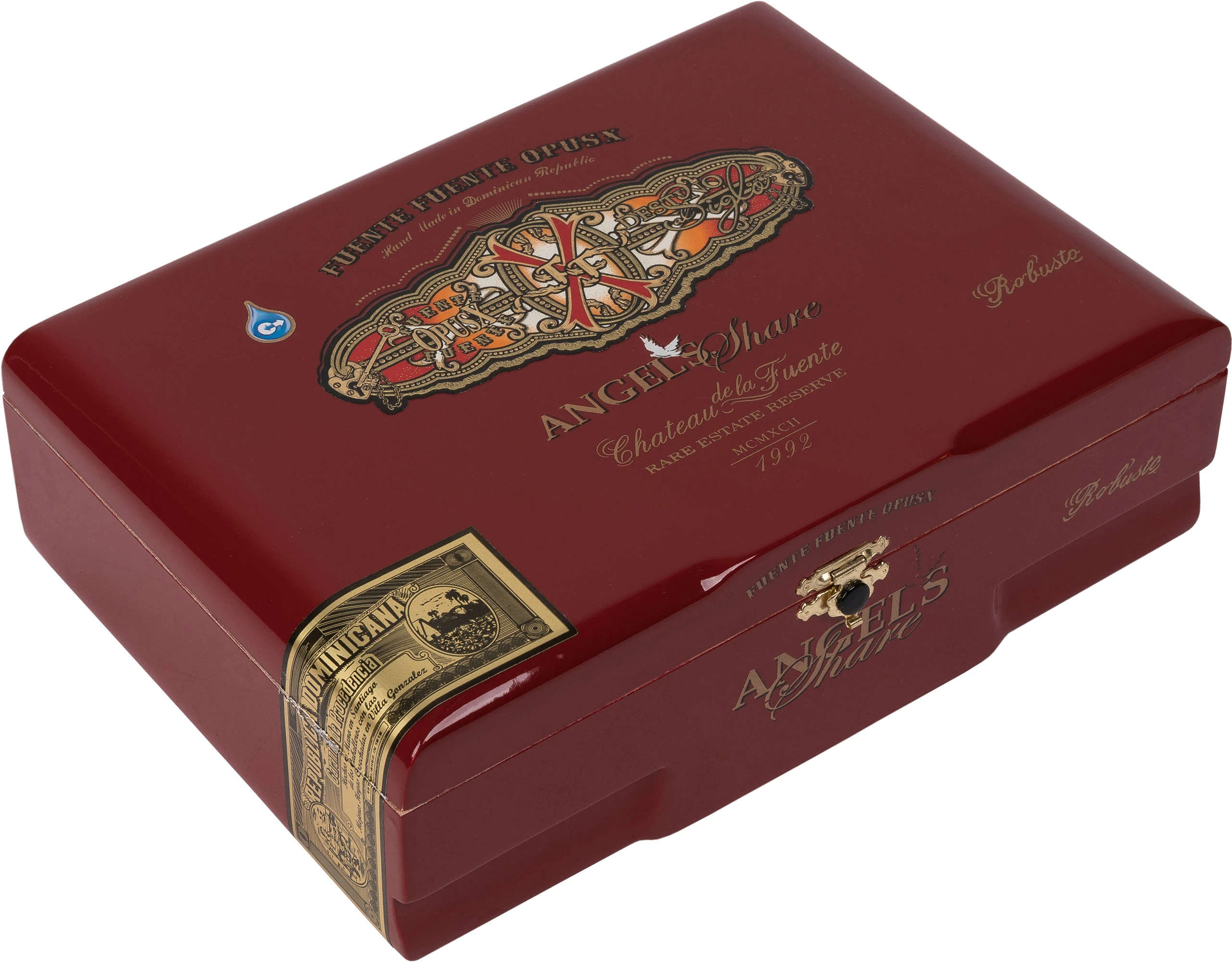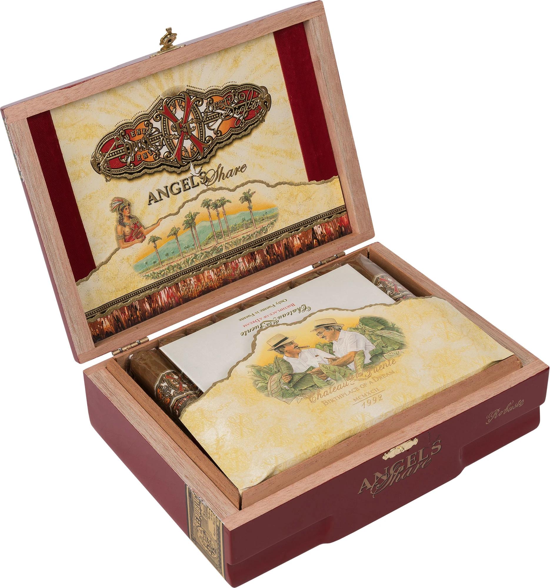 Format: Robusto Inch: 5,25” x 50 Mm: 133 x 20 Moc: Medium Filler: Dominican Binder: Dominican Wrapper: Dominican Sungrown Habano Opakowanie: Skrzynka Ilość sztuk w opakowaniu: 29 Podana wartość jest ceną za 1 sztukę cygara. Marka Fuente Fuente Opus X ma w swojej ofercie wiele cygar z różnymi mieszankami. To co je łączy, poza ringiem, to fakt, że wszystkie są wykonane z dominikańskiego wypełniacza (filler), zawijacza (binder) i owijki (wrapper). Linia Angel's Share to wyjątkowe dzieło wśród cygar. Termin "Angel's Share" używany jest w świecie producentów win i mocnych alkoholi, którzy przechowują alkohol w dębowych beczkach tak aby dojrzał. Podczas odpowiednio długiego leżakowania część alkoholu naturalnie paruje, ""uchodzi do nieba"" i ta właśnie część nazywana jest "Dywidendą dla Aniołów"" (Angel's Share). U Fuente początek tej linii jest związany z tragicznym wydarzeniem - pożarem składu tytoniu w 2012 roku. W składzie tym przechowywany był tytoń z lat 40-tych i 50-tych ubiegłego wieku, który Carlos "Carlito" Fuente chciał użyć do produkcji limitowanej edycji cygar na setną rocznicę powstania firmy. Cały plan "uszedł z dymem" ale też był początkiem nowej linii cygar: Angel's Share, która podobnie jak linia Opus X jest wyjątkowym Puro Dominicano (Czysta Dominikana). Co odróżnia linię Angel's Share od klasycznej linii Opus X? Carlos Fuente Jr. zdecydował się użyć na wrappera (pokrywę) liść ze środkowej części krzewy, a nie jak w Opus X, z samej góry. Carlos skupił się bardziej na tej części rośliny, w której, jego zdaniem, znajduje się najwięcej "serca" i smaków w liściu tytoniu. Od prawie pięciu lat Angel's Share ta jest uznawana za najpopularniejszą markę wśród konsumentów w sklepach tytoniowych w USA i jest jedną z najtrudniejszych do znalezienia. Jest jeszcze jedna rzecz, która wyróżnia tą linie: część dochodów ze sprzedaży cygar Angel's Share jest przekazywana na cele charytatywne Fuente's Cigar Family.
