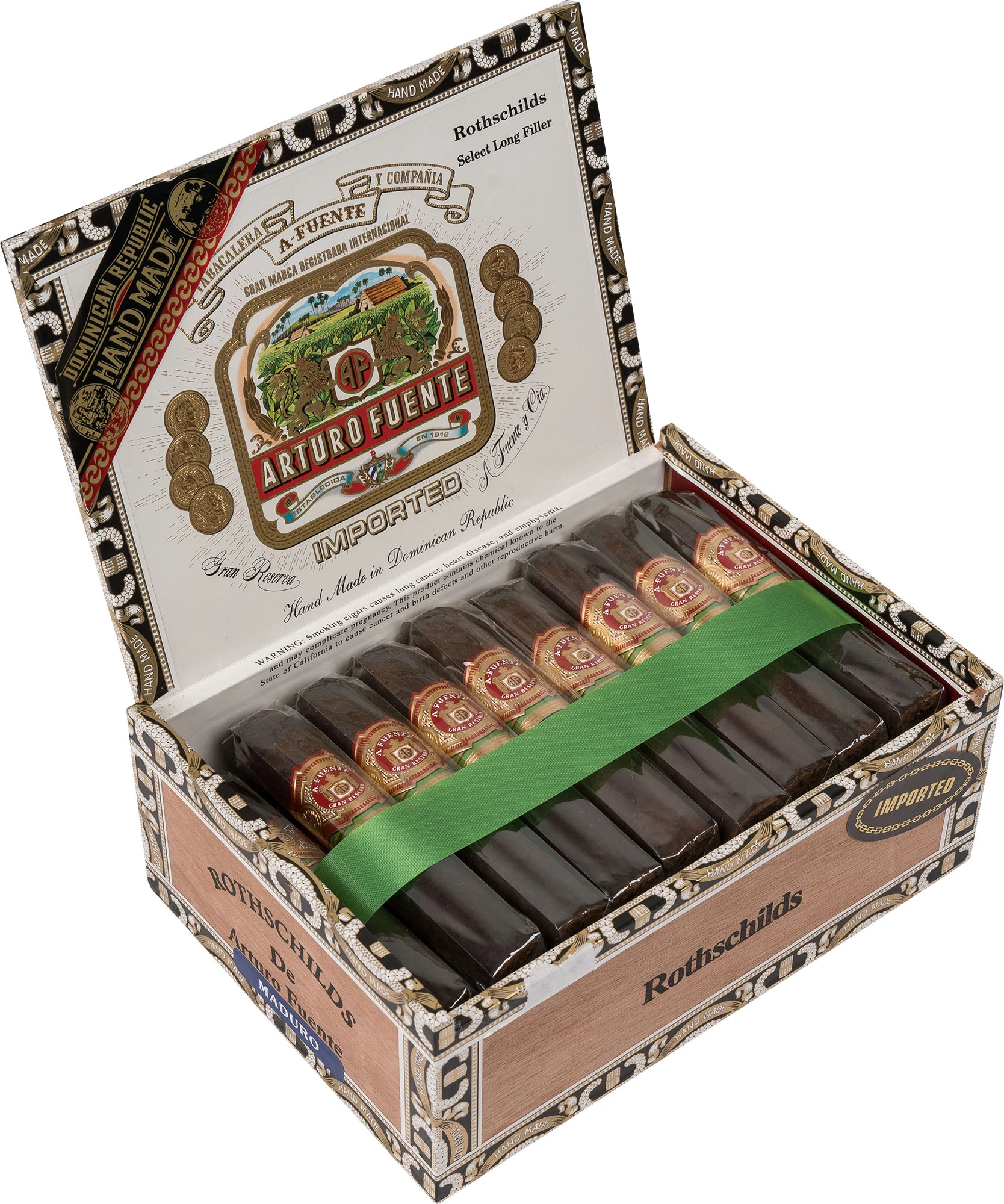 Format: Rothschild Inch: 4,5” x 50 Mm: 114 x 20 Moc: Medium-Full Filler: Dominican Binder: Dominican Wrapper: USA Connecticut Broadleaf Opakowanie: Skrzynka Ilość sztuk w opakowaniu: 25 Podana wartość jest ceną za 1 sztukę cygara. Cygaro Arturo Fuente Gran Reserva Rothschilds Maduro wytwarzana jest ręcznie, w Tabacalera Fuente na Dominikanie i składa się ze specjalnie wyselekcjonowanych tytoni z prywatnego rodzinnego rezerwatu - Chateau de la Fuente. Mieszanka bogatego dominikańskiego filler’a i binder’a jest zawinięta w ciemny i intensywny w aromatach liść USA Connecticut Broadleaf. Po zwinięciu, cygara są leżakowane w cedrowych skrzyniach, a samo cygaro ozdobione jest eleganckim czerwono-zielono-złotym ringiem ze znakiem Fuente. Konstrukcja jest absolutnie niezrównana. Jeszcze przed zapaleniem cygaro "częstuje" intensywnym aromatem kakao, a pierwsze pociągnięcia dostarczają gęstego kremowego i gładkiego dymu. Pierwsza tercja to aromaty drewna, czarnej kawy i słodkich przypraw, w kolejnych tercjach pojawiają się delikatne nuty orzechowe, wanilii po to aby na koniec palenia połączyć się z aromatem białego pieprzu.