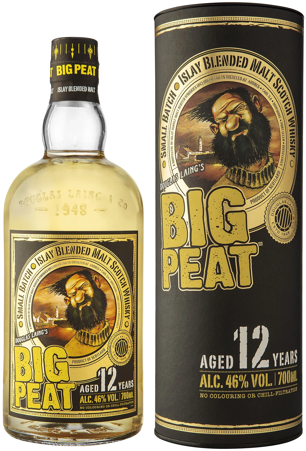 12-letnie wydanie kultowej whisky blended malt Big Peat w której znajdziemy nuty zwęglonego dębu, dymu z komina, wypełnionych morską wodą skalnych basenów pływowych, rozgrzanej w słońcu smoły i długi finisz z brązowym cukrem, popiołem z ogniska i prawdziwą fenolową jakością. Big Peat jest idealnym przykładem Islay w butelce. Jest kompozycją whisky single malt pochodzących wyłącznie z wyspy Islay. Caol Ila wnosi słodycz, Bowmore idealną równowagę, Ardbeg nuty medyczne i ziemistość, a Port Ellen elegancję. Whisky została zabutelkowana w naturalnym kolorze, bez filtracji na zimno.