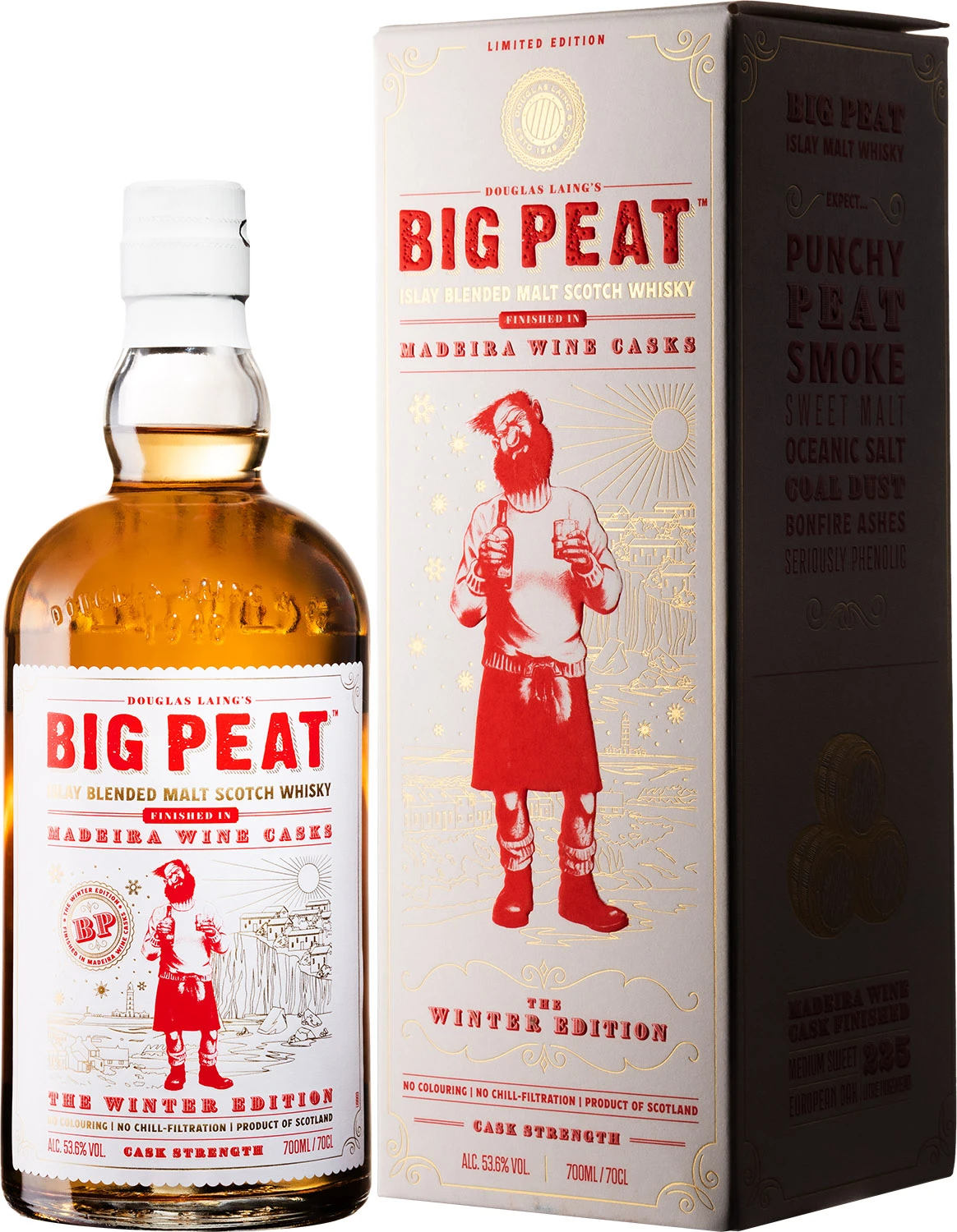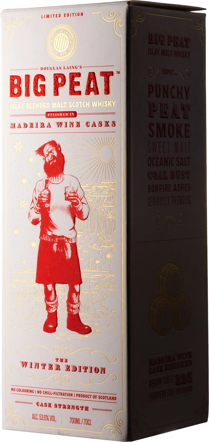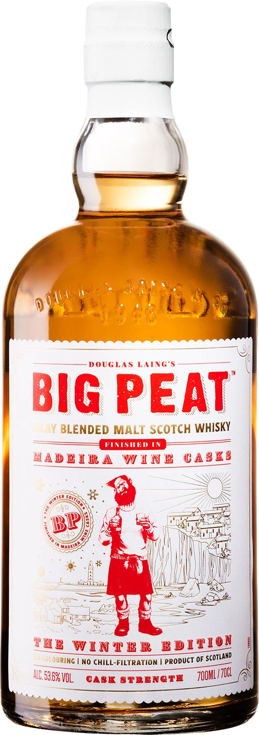 Odważna zimowa edycji whisky Big Peat, w której wietrzna, pełna słonej, morskiej bryzy wyspa Islay spotyka się ze słoneczną i półtropikalną wyspą Madera. Big Peat to połączenie wyłącznie szkockich whisky single malt z wyspy Islay z destylarni Coal Ila, Ardbeg, Bowmore i Port Ellen, które były finiszowane w beczkach po winie Madera. Whisky została zabutelkowana w naturalnym kolorze, bez filtracji na zimno i z mocą 53,6%. W zapachu słód i morskie powietrze z nutą solonego karmelu, wanilii i długotrwałym torfowym posmakiem Islay. W smaku bogate warstwy melasy i crème brûlée, podkreślone nutą spalonej skórki pomarańczowej, pyłu węglowego i wyrazistym charakterem fenolowym. Finisz jest długi i dymny, z długotrwałym posmakiem cytrusów, soli morskiej i ciepłego, ziemistego żaru ogniska.