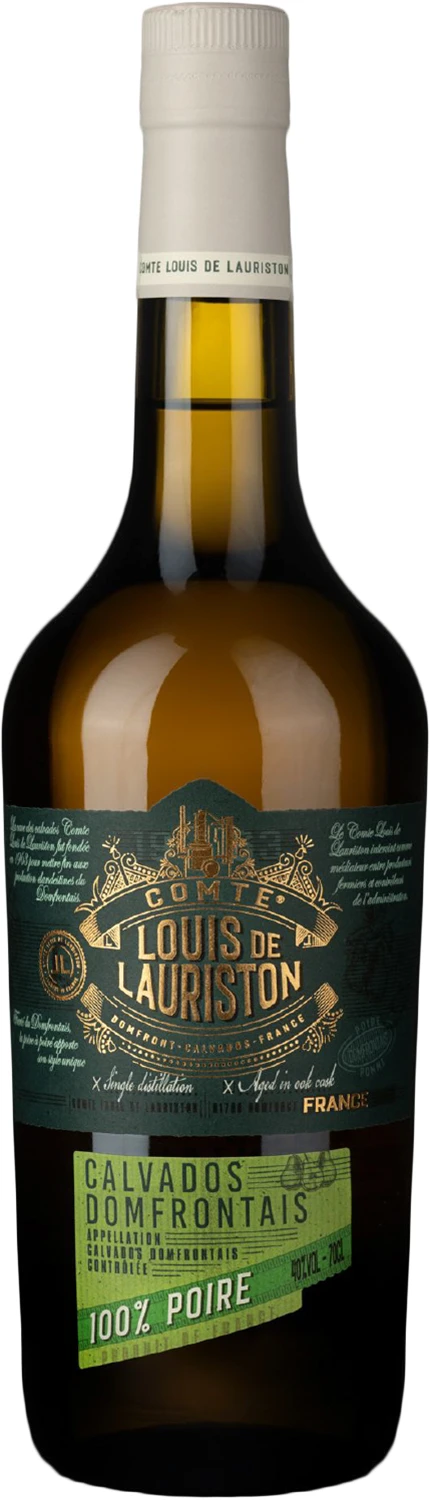 Zgodnie z regułami apelacji, calvadosy DomfrontaIs powinny być skomponowane przynajmniej w 30% z gruszek. Comte Louis Lauriston, na co dzień, tj. do swoich regularnych edycji używa tych gruszek aż 60, a nawet 70%. Tym razem jednak poszedł o krok dalej i stworzył wersję 100%. Destylowany jednokrotnie w aparacie kolumnowym ma delikatny, złoty kolor i to co zachwyca najbardziej, bardzo świeży, soczyście owocowy aromat. Nuty gruszki są ewidentne. Nie trzeba się długo zastanawiać, analizować bukietu by odnaleźć dziecięce wspomnienie gruszek w słodkim syropie z goździkami. W ustach jest bardzo elegancki, pełny, a jednocześnie świeży.