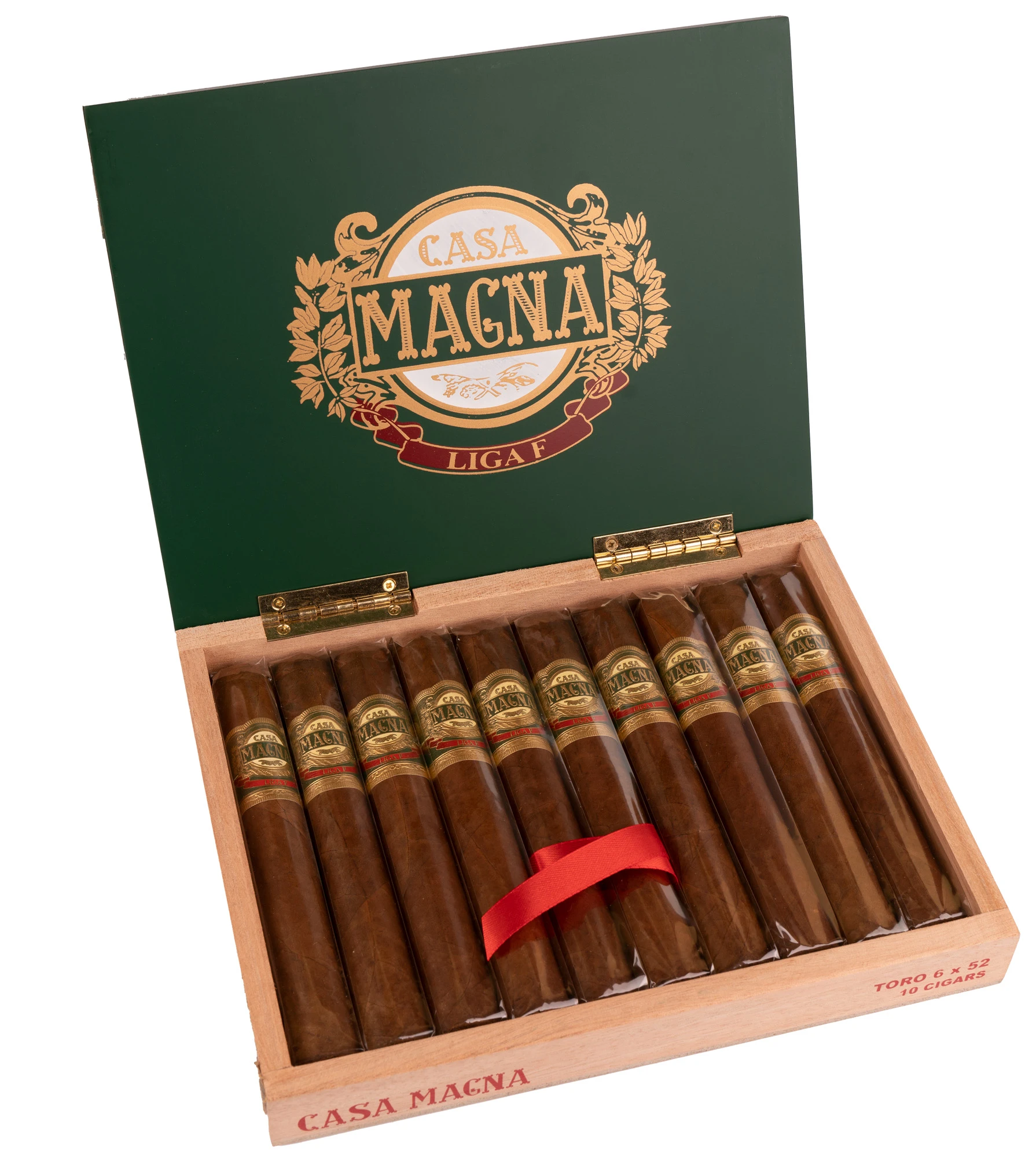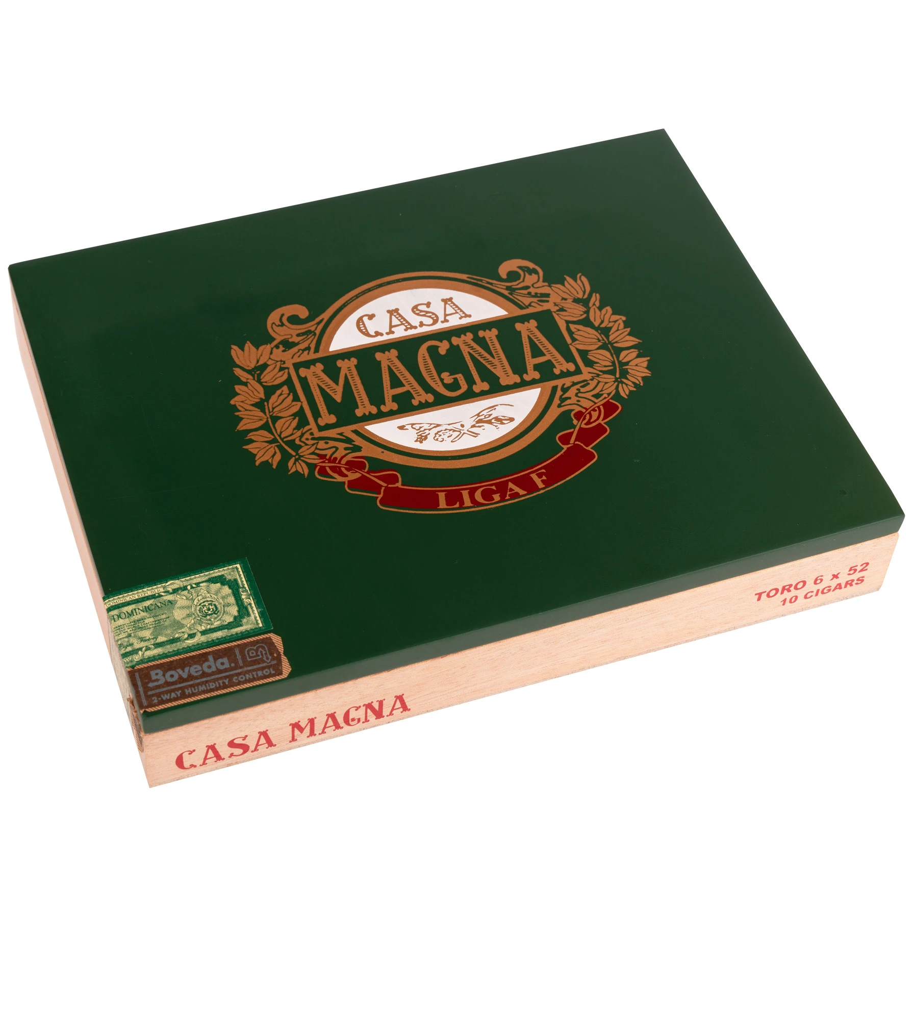 Format: Toro Inch: 6” x 52 Mm: 152 x 20 Moc: Medium-Full Filler: Nicaragua, Dominican Binder: Dominican Wrapper: Ecuador Corojo Opakowanie: Skrzynka Ilość sztuk w opakowaniu: 10 Podana wartość to cena za 1 sztukę cygara Znana jako nikaraguańskie cygaro Casa Magna produkowana przez Plasencia dla rodziny Quesadas otwiera nowy rozdział w swojej historii - rozpoczynając produkcję w Dominikanie. Teraz Quesada rozszerza swoje portfolio o nową linię - Casa Magna Liga F (skrót Fuerte czyli silny po hiszpańsku), która po raz pierwszy zaprezentowana została w 2021 na targach PCA w w Las Vegas. "Połączenie idealnie zbalansowanego tytoniu z Nikaragui i Republiki Dominikany zapewnia cudowną złożoność” – jak opisał to Manuel „Manolo” Quesada Jr., prezes Quesada Cigars. Słodka, bogata, pełnej mocy mieszanka najlepszych tytoni pakowana po 10 sztuk cygar w piękne, w kolorze intensywnej zieleni drewniane pudełka.