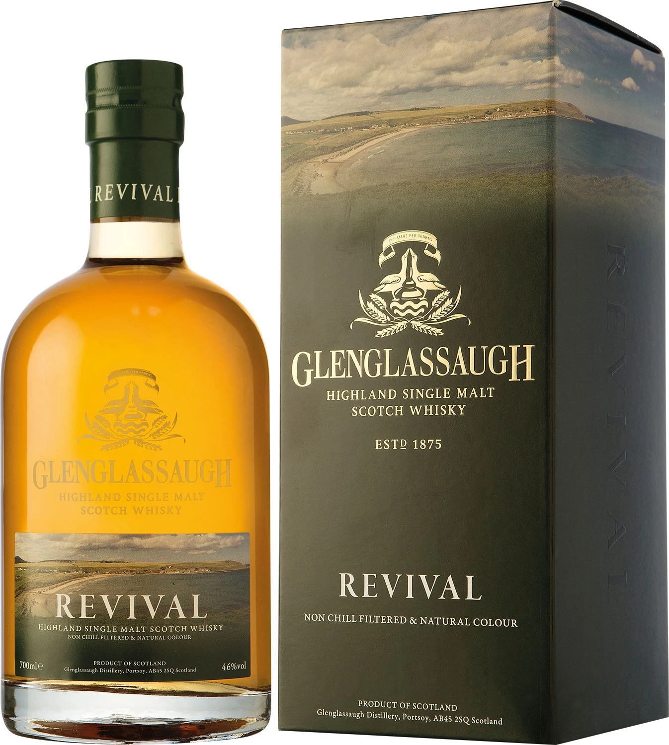 Revival to pierwsza edycja whisky z destylarni Glenglassaugh wypuszczona na rynek po ponad 20 letnim „uśpieniu” gorzelni. Whisky dojrzewała w beczkach po bourbonie i czerwonym winie aby następnie na kilka miesięcy trafić do beczkach po Sherry Oloroso. Nie była filtrowana na zimno i barwiona karmelem. Zachwyca naturalnym kolorem miedzi i stylem typowym dla Highland. W nosie delikatne aromaty karmelu i toffi, z nutami orzechów, sherry, mlecznej czekolady i miodu. W zapachu znajdziemy również dojrzałe śliwki, czerwone owoce jagodowe i odrobinę ziemistego, palonego dębu. W ustach jest krągła, kremowa z odrobiną słodyczy i wyczuwalnymi nutami śliwek, wiśni, pomarańczy, orzecha włoskiego, czekolady, miodu i pieprznej dębiny. Finisz rozgrzewający z nutami przypraw korzennych, sherry i karmelu.