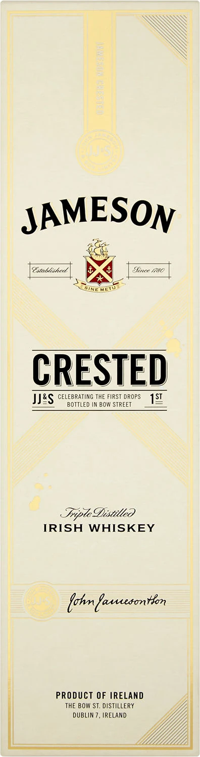 Na początku Jameson był sprzedawany kupcom bezpośrednio w beczkach. Wszystko zmieniło się w 1963 roku, gdy pierwsze butelki opuściły destylarnię przy Bow Street 7 w Dublinie. Jameson Crested jest inspirowana pierwszymi kroplami butelkowanej whiskey Jameson. Zapach: wyraźny, z nutą sherry Smak: delikatny odcień sherry i opalonego drewna z nutami owoców, przypraw korzennych i czekolady Finisz: długi i ciepły smak sherry
