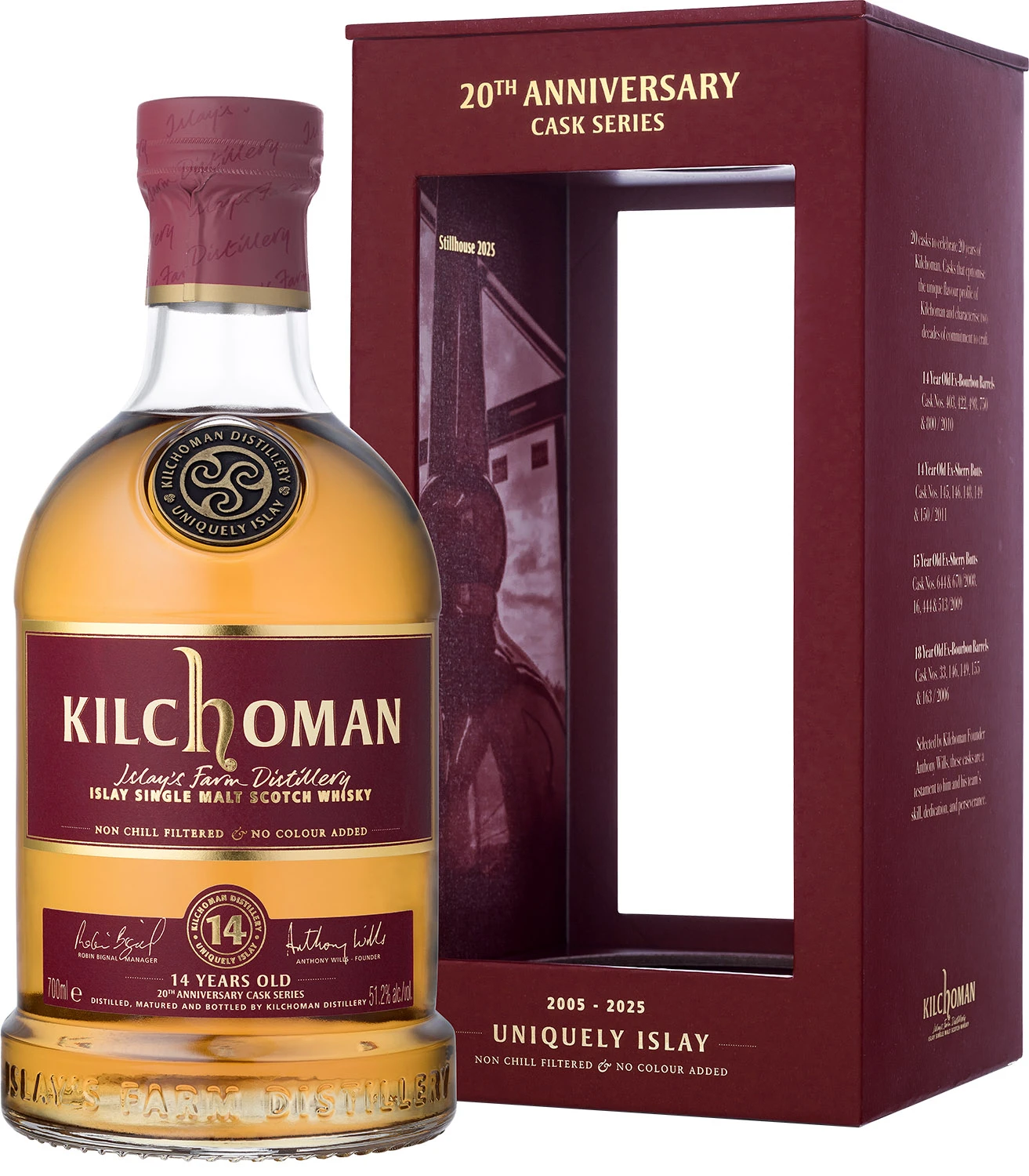 Jedna z butelek wchodzących w skład specjalnej, limitowanej serii czterech whisky wydanej z okazji 20-lecia destylarni Kilchoman. Seria została zabutelkowana z dwudziestu beczek, które osobiście wybrał założyciel destylarni Kilchoman Anthony Wills. W serii dostępne są cztery edycje, z których każda składa się z pięciu specjalnie wyselekcjonowanych beczek, podkreślających dwie różne strony unikalnego charakteru whisky Kilchoman starzonej w beczkach po bourbonie i po sherry . Wersje ex-bourbon charakteryzują się słonym torfowym dymem i cytrusową słodyczą. Z kolei ciemniejsze wersje ex-sherry oferują bogatszy profil, z nutami suszonych owoców, dymu BBQ i mieszanki przypraw. Prezentowana edycja KILCHOMAN 14 YO Ex-Bourbon Barrels to kompozycja whisky z pięciu beczek bourbon barrels o nr: 403, 422, 498, 750 i 800 / 2010. Napełniono tylko 1120 butelek. Moc 51,2%