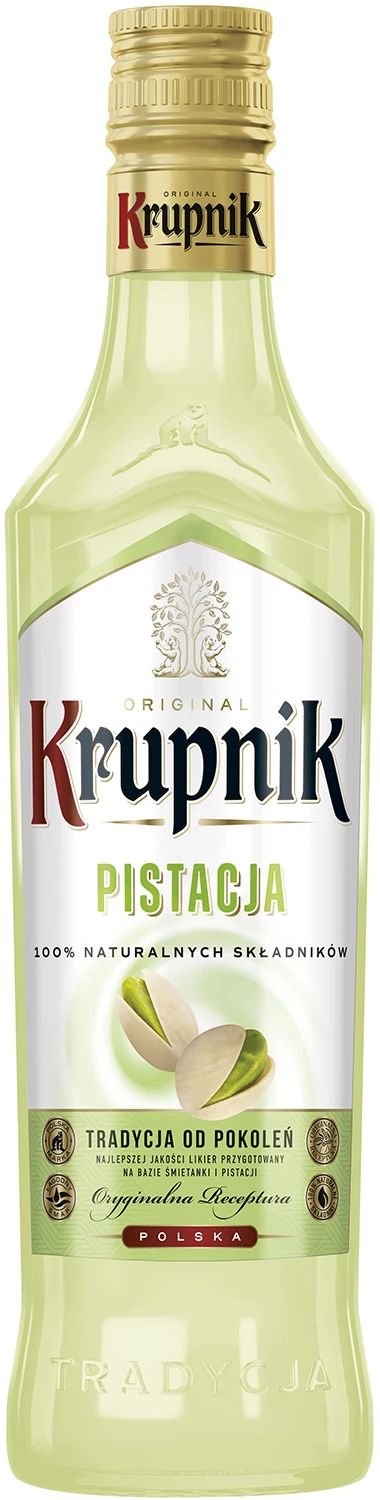 Pistacje to orzechy, których nie trzeba chyba nikomu przestawiać. Charakterystyczny zielony kolor orzeszków w lekko rozchylonej łupince zna prawie każdy i z pewnością chętnie po nie sięga jako przekąska do filmu czy na imprezach gdy tylko pojawią się na stole. Nic więc dziwnego, że ten smak znalazł uznanie w innych kategoriach spożywczych takich jak lody czy ciasta. Wychodząc naprzeciw naszym konsumentom przygotowaliśmy dla nich wyjątkową kompozycję likieru na bazie aksamitnej śmietanki i smaku pistacjowego. Swój zielony kolor i wspaniały aromat pistacji zawdzięcza starannie dobranym, najwyższej jakości wyłącznie naturalnym składnikom. Krupnik o smaku pistacjowym to prawdziwa uczta dla duszy i ciała.