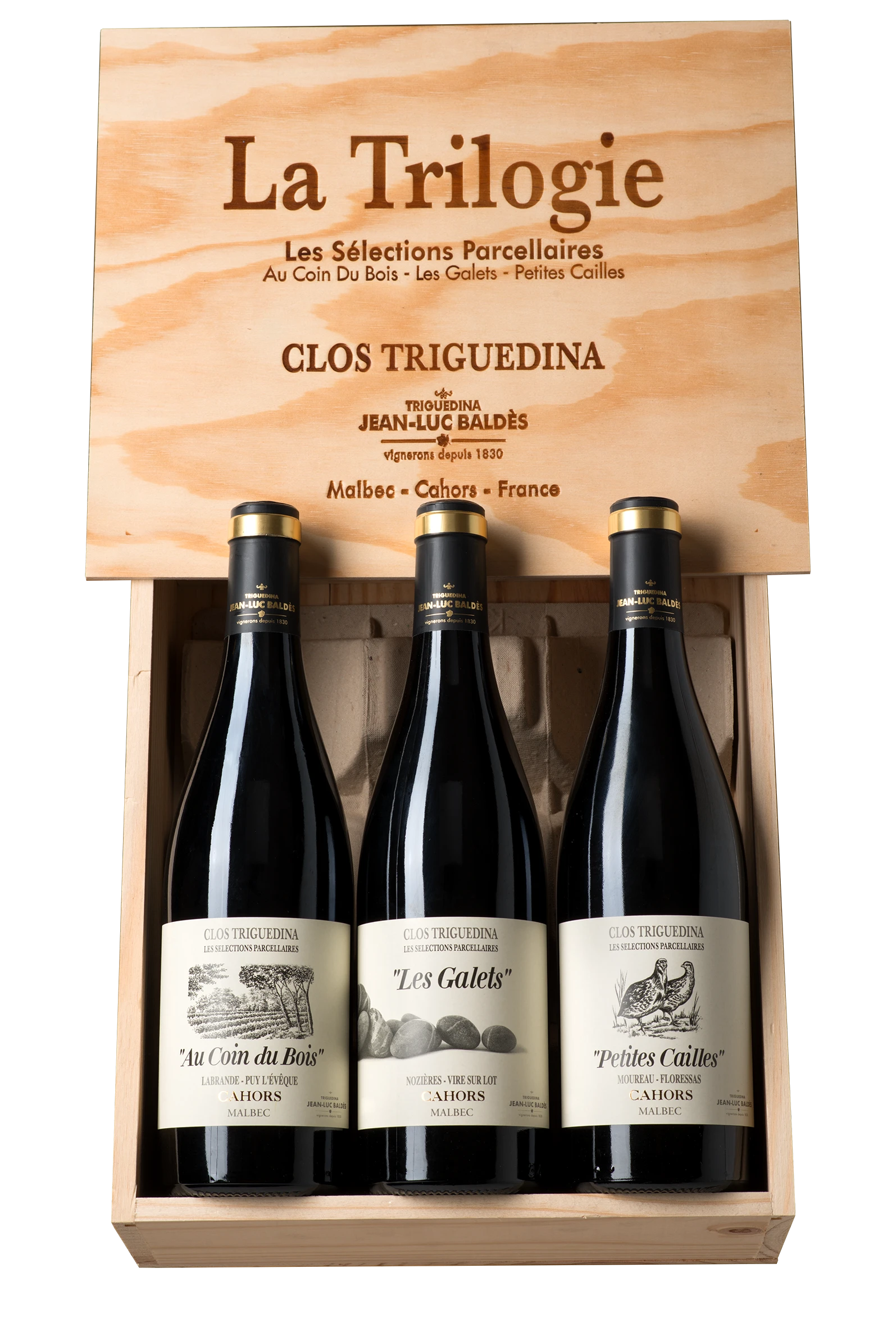 Elegancka drewniana skrzynka skrywa w sobie kwintesencję regionu Cahors. Trilogie składa się z trzech różnych win, każde w 100% skomponowane z gron Malbec, pochodzących z trzech różnych tarasów i reprezentujące trzy różne mikroklimaty Cahors. AU COIN DU BOIS to 100% Malbec z 2-ego Tarasu charakteryzującego się glebą w postaci czerwonej gliny z warstwą wapienia. Niewielkie nachylenie zbocza, z dużą ekspozycją na słońce. Winogrona były zbierane ręcznie, a wino dojrzewało 12 miesięcy w beczkach z francuskiej dębiny. W aromacie mocno obecne ciemne owoce: porzeczki, jeżyny i dojrzałe śliwki. W ustach bogate i pełne ciała. Owocowość, krągła tanina i delikatna dębina. Świetne do pieczonych mięs, gulaszy i serów. LES GALETS 100% Malbec z 3-ciego Tarasu, o glebie bogatej w glinę i wapień, z osadami żelaza i pozostałościami lawy oraz intensywnej ekspozycji na słońce. Ręczne zbiory i dojrzewanie przez rok w beczkach z dębu francuskiego. Bogaty i wyrazisty aromat, pełen śliwek, jeżyn i przypraw. W smaku gęste, z dużą koncentracją czarnych owoców, przypraw i kawy. Złożona struktura zapewniająca żywy i długi finisz. Znakomite do czerwonych mięs, jagnięciny i kaczki. LES PETITES CAILLES Malbec (100%) z 4-tego Tarasu, o glebie wapiennej bogatej w żelazo. Tak samo jak przy pozostałych winach z serii Trilogie, owoce byle zbierane ręcznie, a dojrzewanie trwało 12 miesięcy w beczkach z francuskiej dębiny. Bardzo intensywny bukiet obfitujący w czarną porzeczkę, lukrecję i miętę. W smaku pełne i głębokie z wyczuwalną truflą, ciemnymi śliwkami i szeroką gamą przypraw. Bardzo długi finisz, z ładnie zaznaczoną taniną. Wino o świetnym potencjalne dojrzewania. Idealne do grillowanych mięs, oraz dań z truflami i sosami na bazie grzybów.