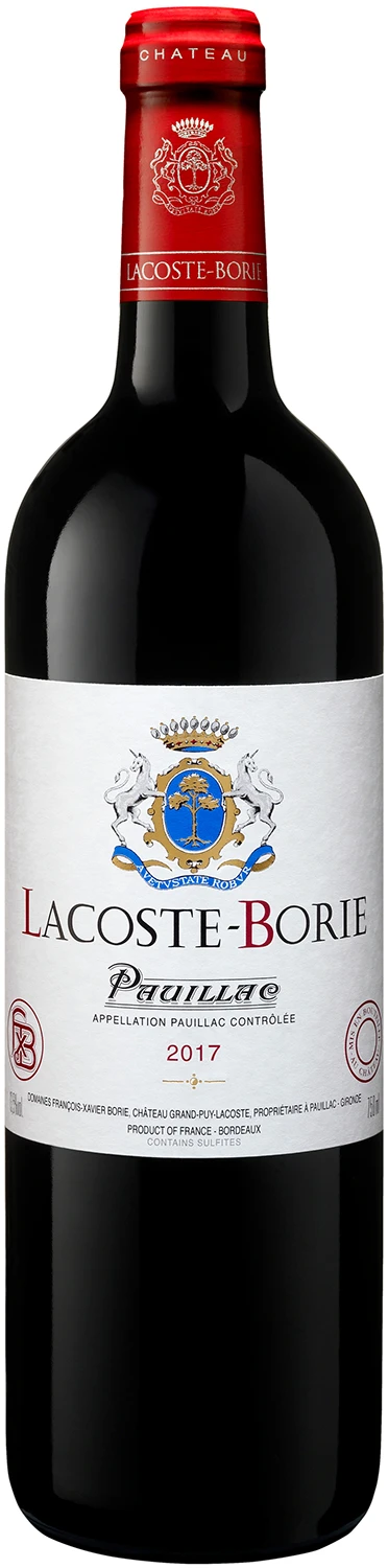 Chateau Lacoste- Borie jest drugą etykietą Chateau Grand-Puy-Lacoste, który jest 5. Cru z apelacji gminnej Pauillac. Posiadłość obejmuje 90 ha, z czego 60 ha obejmuje nasadzenia winorośli. Rocznik 2017 jest to kupaż Cabernet Sauvignon 65% i Merlot 26% oraz Cabernet Franc 9%. Wino dojrzewało 14-16 miesięcy we francuskich beczkach barrique, z czego 45% stanowią nowe beczki. Wino, którym można się cieszyć już za młodu, gdyż posiada miękkie i krągłe taniny, ale z potencjałem do dalszego leżakowania.