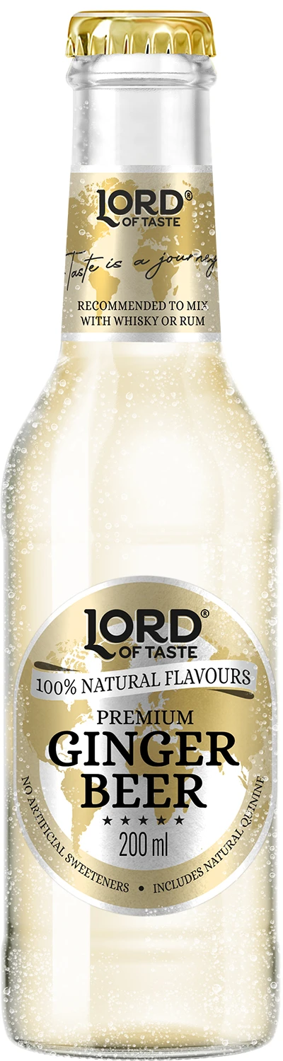 Lord of Taste Premium Ginger Beer to wyjątkowa kompozycja krystalicznie czystej wody oraz dwóch rodzajów imbiru. Imbir z Jamajki odpowiada za słodki posmak, a imbir pochodzący z południowo-wschodniej Azji ma wyjątkowo mocny i intensywny aromat, dodaje więc szczypty pikanterii. Całość nasycona jest dwutlenkiem węgla, który pozwala na wyzwolenie unikatowych, bardzo przyjemnych cytrusowych aromatów. Lord of Taste Premium Ginger Beer to idealne zbalansowana kompozycja smaków oraz niezastąpiony element drinków: z wódką, rumem, brandy czy ginem.