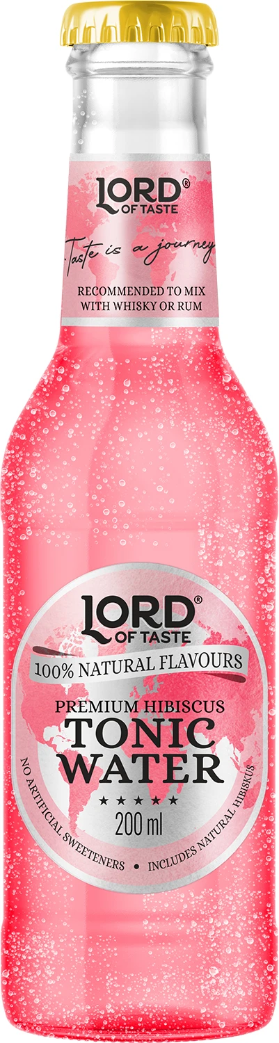 Lord of Taste Premium Hibiscus Tonic Water to wyjątkowa mieszanka krystalicznie czystej wody oraz ekstraktu z kwiatów hibiskusa, rosnących w Tajlandii. Wyjątkowo aromatyczna kompozycja, została wzbogacona o naturalne ekstrakty chininy pozyskiwanej z kory drzewa chinowego. Całość nasycona jest dwutlenkiem węgla, który pozwala na wyzwolenie unikatowych, bardzo przyjemnych kwiatowych aromatów. Lord of Taste Premium Hibiscus Tonic Water ma piękny różowy kolor, doskonale smakuje solo, jak również po zmieszaniu z ulubionym białym alkoholem takim jak Gin, Wódka czy Wermut.