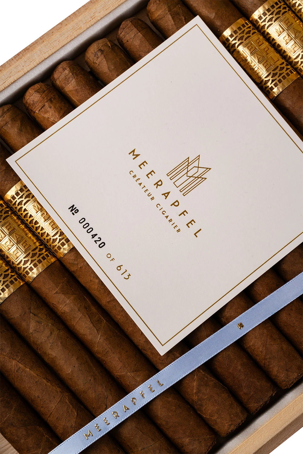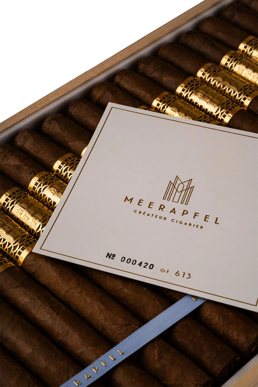 Format: Lonsdale Inch: 6 3/4" x 43 Mm: 171 x 17 Moc: Medium Filler: Undisclosed Binder: Undisclosed Wrapper: Dominican Opakowanie: Skrzynka Ilość sztuk w opakowaniu: 25 Podana wartość to cena za 1 sztukę cygara Jeden z najnowszych wypustów cygarowych od Meerapfel, Meerapfel Ernest, został nazwany na cześć patriarchy firmy Ernesta Meerapfela, który chciał "zrewolucjonizować świat tytoniu premium" pod koniec XIX wieku. Historia się potwierdza. Meerapfel od lat dostarcza luksusowe, bezkompromisowe mieszanki. Można śmiało powiedzieć, że dziedzictwo rodziny jest bezpieczne. Limitowana do zaledwie 613 pudełek, Meerapfel Ernest zachowuje tajemnicę marki i nie ujawnia użytego tytoniu użytego ani we wkładce (filler) ani w zawijaczu (binder). Wiadomo jednak, że mieszanka ta wykorzystuje jedwabiście gładką owijkę z afrykańskiego Kamerunu pod ozdobnymi złotymi wstążkami. Ale ten klejnot to nie tylko ładny wygląd. Spodziewać się można zrównoważonej, średnio mocnej mieszanki z nutami cedru, skóry i ziemi. To smakołyk, który warto zachować na specjalną okazję.