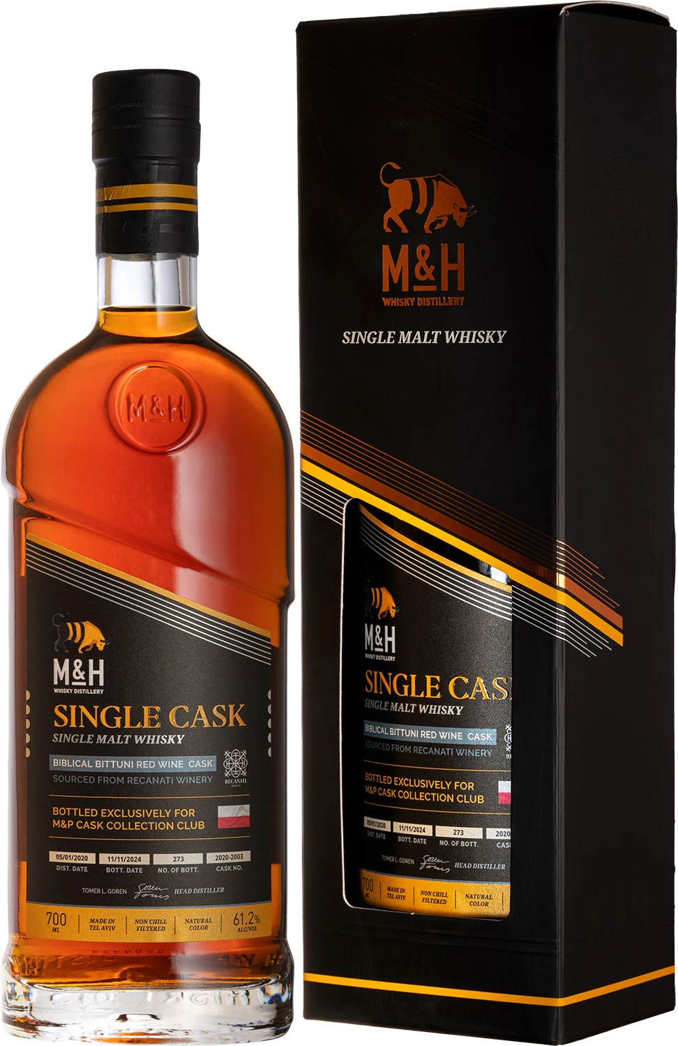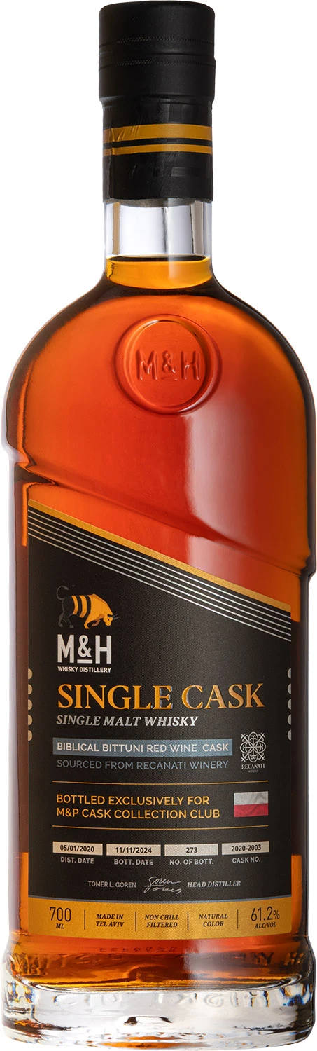Wyjątkowa whisky single cask z destylarni Milk&Honey zabutelkowana w ramach serii M&P Cask Collection Club. Whisky została wydestylowana 5 stycznia 2020 roku i dojrzewała w beczce nr 2020-2003 po czerwonym izraelskim winie ze szczepu Bittuni wyprodukowanym przez winnicę Recanati. Bittuni, to lokalna, starożytna, czerwona odmiana winogron, wykorzystywana do produkcji wina jeszcze przed Chrystusem. Szczep ten praktycznie już nie występuje, zostało dosłownie tylko kilka krzewów. Whisky została zabutelkowana 11 listopada 2024 roku. Do sprzedaży trafiło zaledwie 273 butelki. Whisky nie była barwiona karmelem i nie została poddana procesowi filtracji na zimno. W smaku niezwykle bogata i esencjonalna z nutami miodu, czerwonych owoców, przypraw i dębiny.