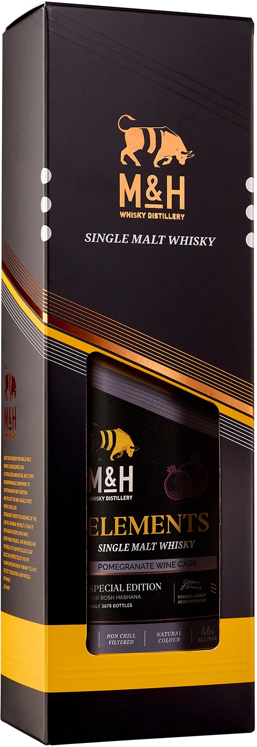 Znana dotychczas z wyższej linii APEX edycja dojrzewana w beczkach po winie z granatów, dołączyła teraz również do linii ELEMENTS. W linii ELEMENTS jest to kompozycja whisky dojrzewanych w beczkach po bourbonie, beczkach STR i wspomnianych beczkach po winie z granatów. Owoc granatu od pokoleń jest nierozerwalnie złączony z izraelską kulturą, kuchnią i sztuką. Jest to pierwsze limitowane do 3678 butelek wydanie tej whisky. Powstało specjalnie na święto Rosh Hashana (judaistyczne święto Nowego Roku, pierwszy dzień kalendarza żydowskiego. M&H Elements Pomegranate Wine Casks to whisky przepełniona aromatami kwiatów, owoców granatu, ciemnej czekolady, uzupełnionymi nutami pieczonych jabłek i ciepłym cynamonowym finiszem. Whisky została zabutelkowana z mocą 46%, w naturalnym kolorze i bez filtracji na zimno.