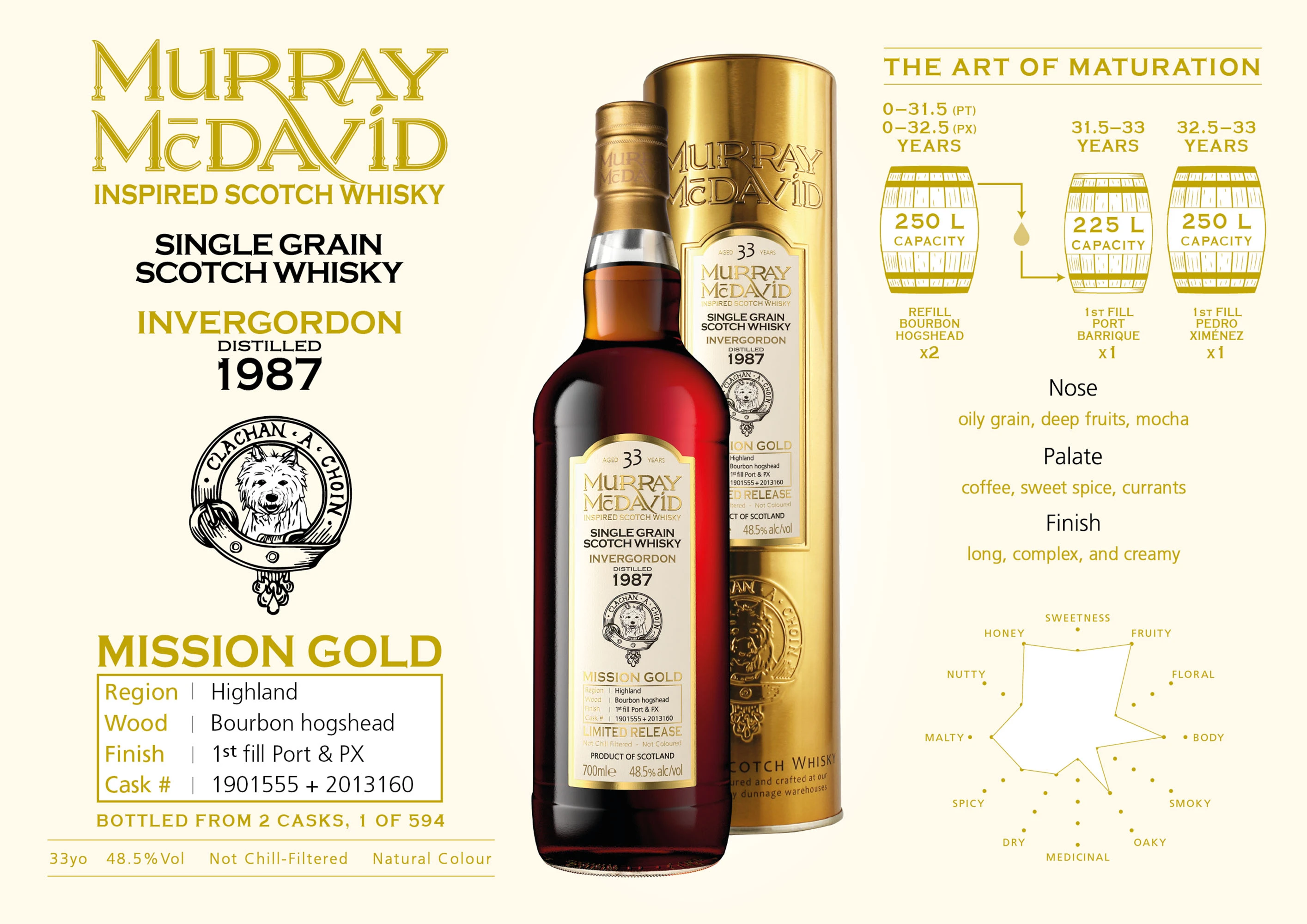 Whisky single grain z destylarni Invergordon, która jest najbardziej na północ położoną gorzelnią zbożową w Szkocji. Invergordon jest sercem wielu słynnych mieszanek szkockiej whisky. Tym razem, przedstawiamy go jako wyjątkową 33-letnią whisky single grain, która po początkowym dojrzewaniu w beczkach Bourbon hogshead ostatnie 18 miesięcy spędziła w beczkach po porto i sherry Pedro Ximenez. Zabutelkowana z dwóch beczek w ilości 594 butelek. Aromat: oleiste ziarno, mocno owocowy, kawa Smak: kawa, słodkie przyprawy, porzeczki Finisz: długi, złożony, kremowy