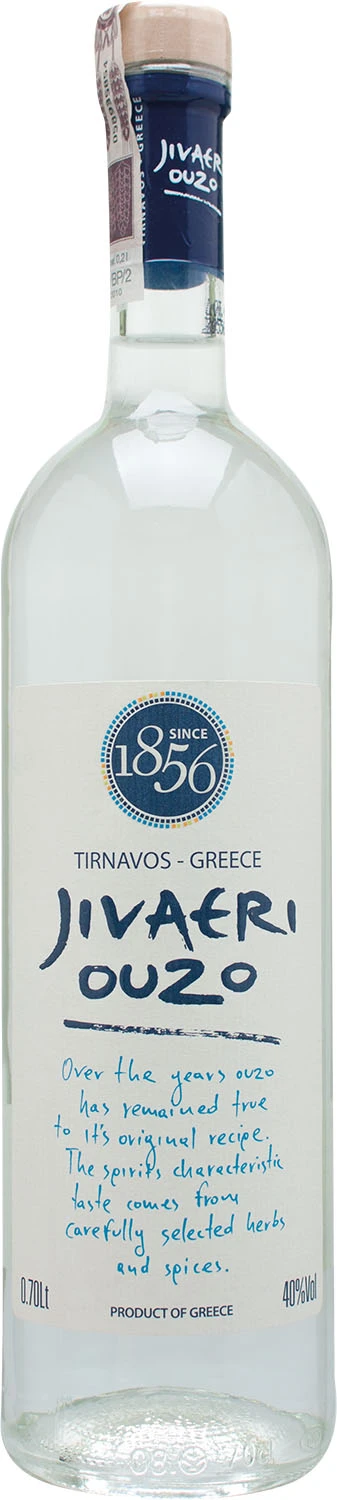 Greckie ouzo to przede wszystkim śródziemnomorska tradycja i narodowy trunek (Unia Europejska przyznała Grecji w 2006 roku wyłączność na jego produkcję). Składnikami Ouzo Jivaeri jest krystaliczna i bogata w minerały woda z Olimpu, najlepszej jakości destylat gronowy oraz kombinacja 14. starannie dobranych i wyselekcjonowanych aromatycznych nasion i ziół, takich jak fenkuł, anyż, gałka muszkatołowa czy aster. Powstaje w procesie podwójnej destylacji alembikowej i późniejszej podwójnej filtracji z kilkumiesięcznym okresem przechowywania w zbiornikach ze stali nierdzewnej, dzięki czemu staje się przejrzysty i jednorodny. Ouzo, które jest subtelne, o precyzyjnych aromatach. W smaku jest delikatne i bogate w smaku, zachwycając swą delikatnością. Podawać przed lub po posiłku. Świetny w koktajlu z sokiem ananasowym i sokiem z cytryny.