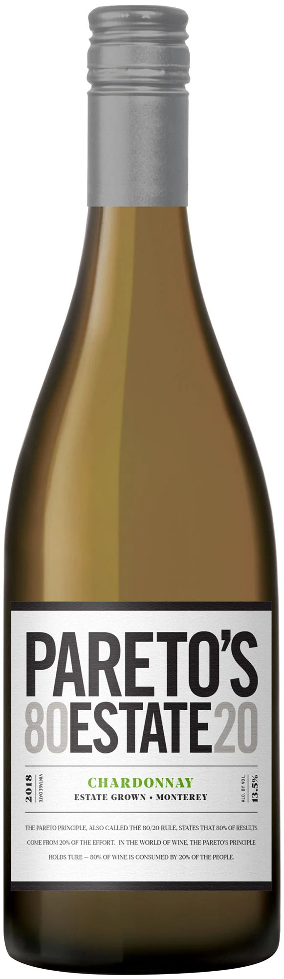 Winnica Pareto’s położona jest w AVA Monterey- amerykańskim obszarze upraw znajdującym się we wschodniej części hrabstwa Monterey w Kalifornii, będąc zarazem częścią większej AVA, którym jest Centralne Wybrzeże. Miejsce to znane jest z nieco chłodniejszego klimatu, gdzie chłodne popołudniowe wiatry wydłużają sezon wegetacyjny, co pozwala uzyskać lepszą jakość gron przy zachowaniu kluczowej kwasowości. W barwie jest jasnocytrusowe. W zapachu dominują aromaty czerwonych jabłek, gruszek, dojrzałych cytrusów, z subtelnymi nutami prażonego dębu, wanilii i toffi, co wskazuje na użycie beczek dębowych w procesie dojrzewania wina. Podniebienie jest dość treściwe i krągłe, dominuje posmak owoców tropikalnych i cytrusowych o zrównoważonej kwasowości i słodkimi przyprawami w końcówce. Podawać do krewetek albo homara w sosie maślanym, do przegrzebków, ravioli z nadzieniem mięsnym, pieczonego łososia i dań z kurczaka.