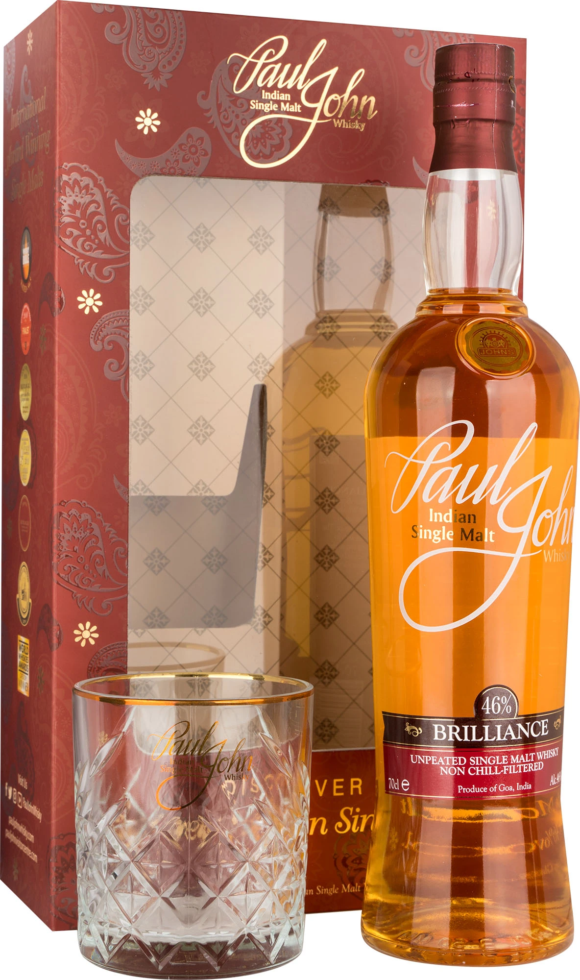 Bardzo elegancki zestaw Paul John Brillance ze szklanką. Brilliance to delikatna, nietorfowa whisky single malt z całej linii Paul John. Została wyprodukowana z rosnącego u podnóża Himalajów 6-cio rzędowego jęczmienia i dojrzewa na wybrzeżu Goa w beczkach po bourbonie. Whisky nie była barwiona karmelem i nie była filtrowana na zimno. W zapachu odnajdziemy aromaty brązowego cukru, słodu jęczmiennego z odrobiną cynamonu, miodu i delikatną nutą przypraw. W ustach gładka i kremowa jest idealnym połączeniem słodyczy i pikantności. Wyczuwamy słód, toffi, czekoladę, pieprz i cynamon. Finisz jest gładki, zaskakująco długi, intensywnie waniliowy.