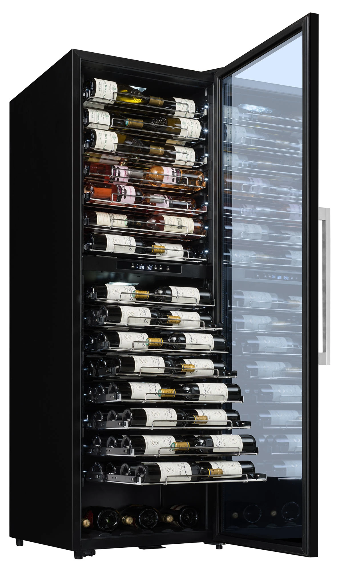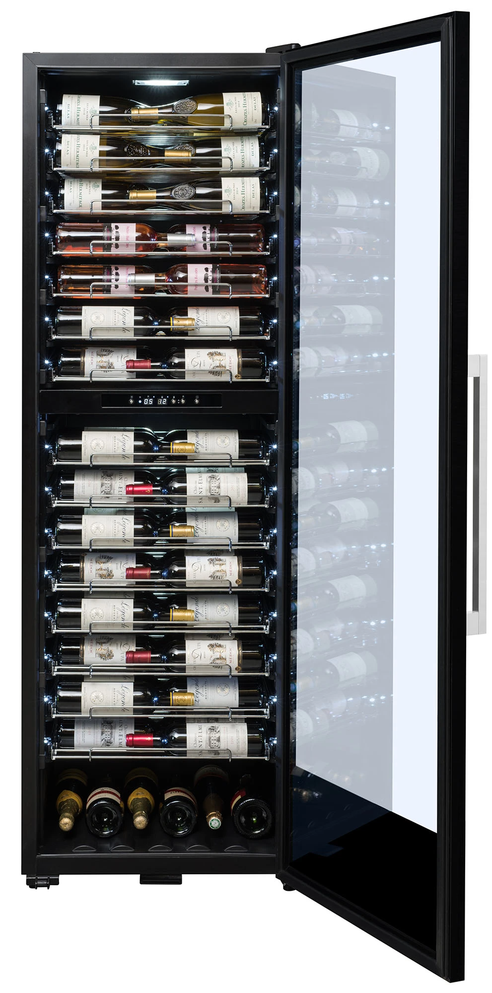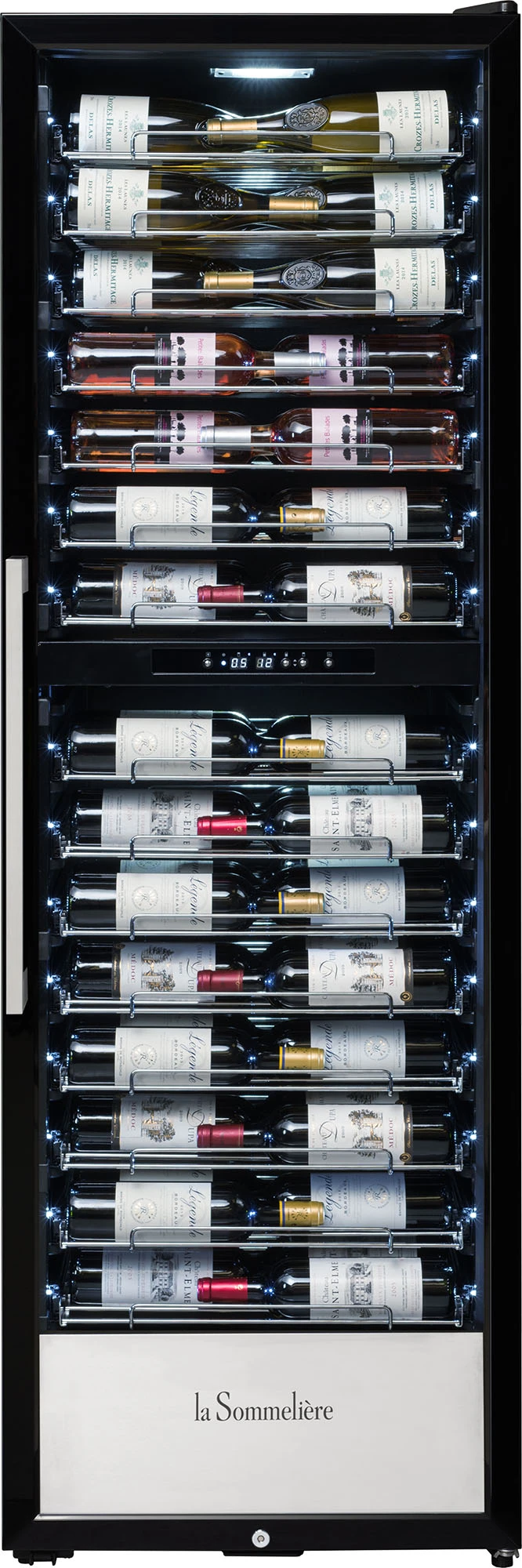 przeznaczona do serwowania wina pojemność 152 butelki (typu Bordeaux 0,75l) 2 strefy temperatury zakres regulacji temperatury od 5 do 12°C / od 12 do 20°C cyfrowy wyświetlacz oświetlenie LED (białe) każdej butelki 15 wysuwanych metalowych półek drzwi: szkło nieprzepuszczające promieni UV rama drzwiczek czarna regulowane nóżki obudowa czarna zamek (możliwość zamknięcia winiarki na klucz) system antywibracyjny głośność 45 dB wymiary (WxSxG): 1830 (regulacja) x 595 x 675 mm