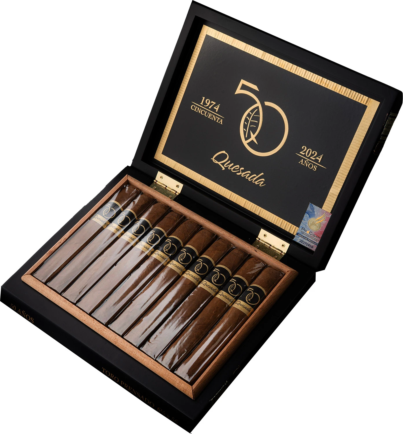 Format: Toro Inch: 6 1/4” x 56 Mm: 159 x 22 Moc: Medium Filler: Dominican, Peru Binder: Nicaragua Wrapper: Ecuador Habano Opakowanie: Skrzynka Ilość sztuk w opakowaniu: 10 Podana wartość to cena za 1 sztukę cygara W 2024 roku firma Quesada Cigars obchodziła 50-lecie powstania i w związku z tym przygotowano na tą okazję wyjątkowe cygaro: Quesada 5OTH Anniversary Toro Prensado. „Mając przywilej uczestniczenia w rozwoju i ewolucji naszej branży, spojrzeliśmy na pięćdziesiąt lat naszej historii i opracowaliśmy cygaro, które będzie odzwierciedlać nasze tradycje produkcji i blendowania tytoniu” - powiedział Manuel »Manolo« Quesada Jr. w komunikacie prasowym. „Podobnie jak w przypadku innych rocznic, osiągnięcie pięćdziesięciu lat jako firma produkująca cygara premium jest kamieniem milowym, który należy świętować”. Pozycja obowiązkowa dla każdego Miłośnika Cygar, szczególnie że produkcja została mocno zlimitowana do jedynie 2.200 pudełek (10 sztuk cygar w pudełku).
