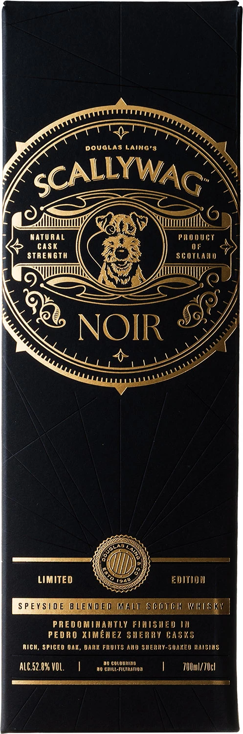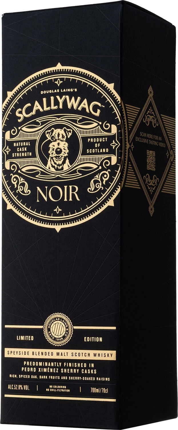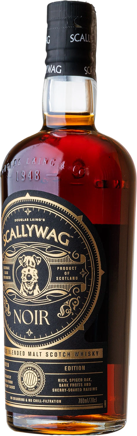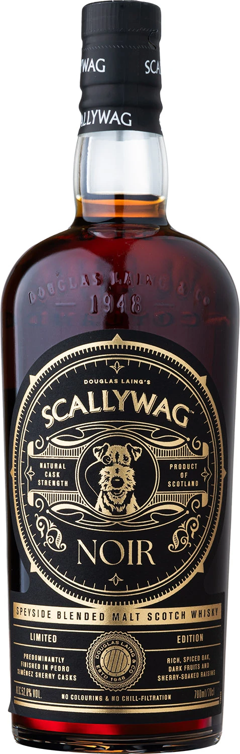 Specjalna, limitowana edycja whisky blended malt Scallywag, która w porównaniu do standardowej wersji, została poddana dodatkowemu finiszowi w beczkach po sherry Pedro Ximenez i zabutelkowana z mocą cask strength 52,8%. Scallywag Noir to whisky o głębokim mahoniowym kolorze, która urzeka aromatami słodkich, ciemnych owoców i rozgrzewających przypraw. W smaku z każdym łykiem ujawniają się bogate nuty ciemnej czekolady, słodko-pikantne nuty dębu i namoczonych w sherry rodzynek. Finisz jest długi, trwały i niezwykle przyjemny, pełny nut melasy, dojrzałych fig i wiśni.