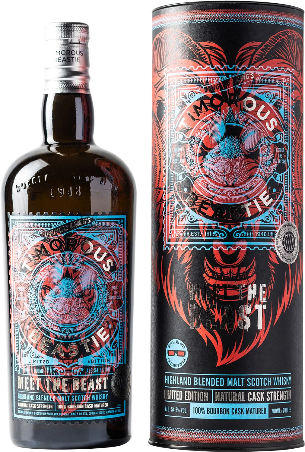 Najnowsza limitowana edycja Timorous Beastie "MEET THE BEAST" starzona wyłącznie w beczkach po bourbonie zabutelkowana z mocą cask strength 54,3%. Wydanie zawiera innowacyjne opakowanie, które ożywia tę specjalną butelkę! Używając specjalnie zaprojektowanych okularów, dołączonych do opakowania, przygotuj się na spotkanie z czającą się bestią ;) Oryginalna Timorous Beastie (nieśmiała bestia), uwieczniona w słynnym szkockim wierszu Roberta Burnsa "To a Mouse", była nieśmiałą, małą polną myszą. Whisky przepełniona jest aromatami i smakami słodkiej wanilii, przyprawionych owoców cytrusowych, soczystego jęczmienia i świeżo upieczonego piernika.