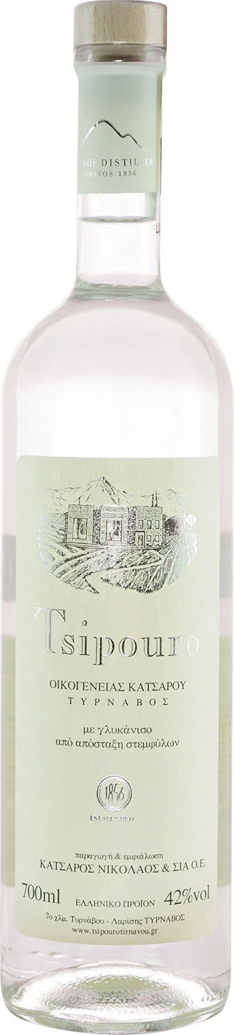 Tsipouro to rodzaj greckiego destylatu z winogron. Receptura na Tsipouro Tirnavou jest utrzymywana w rodzinie Katsaros od 1856 roku. Wytwarzane z gron odmiany Muskat, pilnie strzeżonej mieszanki ziół oraz krystalicznej wody. Powstaje w procesie podwójnej destylacji alembikowej i późniejszej filtracji z kilkumiesięcznym dojrzewaniem w zbiornikach ze stali nierdzewnej. Bezbarwne w kolorze, w zapachu jest aromatyczne i bardzo atrakcyjne. Na podniebieniu jest subtelne i bogate, o unikalnym smaku. Najlepiej pić jako digestif, jako dodatek do pieczonej baraniny i radosnych chwil z przyjaciółmi i rodziną. Białe tsipouro jest wersją z anyżem.
