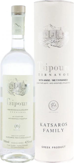 Tsipouro to rodzaj greckiego destylatu z winogron. Receptura na Tsipouro Tirnavou jest utrzymywana w rodzinie Katsaros od 1856 roku. Wytwarzane z gron odmiany Muskat, pilnie strzeżonej mieszanki ziół oraz krystalicznej wody. Powstaje w procesie podwójnej destylacji alembikowej i późniejszej filtracji z kilkumiesięcznym dojrzewaniem w zbiornikach ze stali nierdzewnej. Bezbarwne w kolorze, w zapachu jest aromatyczne i bardzo atrakcyjne. Na podniebieniu jest subtelne i bogate, o unikalnym smaku. Najlepiej pić jako digestif, jako dodatek do pieczonej baraniny i radosnych chwil z przyjaciółmi i rodziną. Białe tsipouro jest wersją z anyżem.