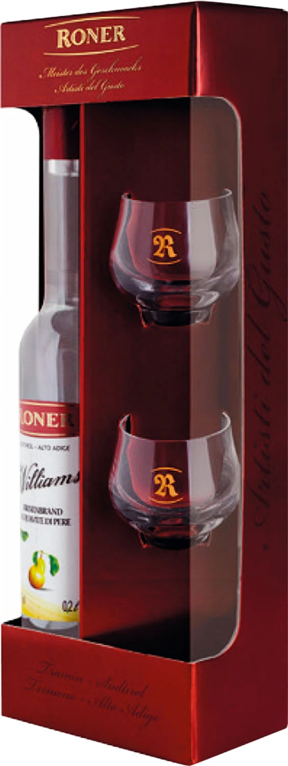 Destylaty owocowe są specjalnością firmy Roner. Destylat z gruszek uzyskuje się ze starannie wyselekcjonowanych i zbieranych prosto z drzewa gruszek Williams. Poddawany podwójnej destylacji tradycyjną metodą w destylatorach bain-marie. Dzięki tej procedurze zachowuje się naturalny owocowy aromat, zapewniając powstanie wysokiej klasy brandy. Eau-de-vie o zawartości alkoholu 70% jest przechowywana w kadziach z nierdzewnej stali, gdzie uzyskuje nie zmieniony, naturalny zapach świeżych gruszek. Po 12-to miesięcznym procesie dojrzewania, podczas którego destylat osiąga optymalną jakość i nabiera słodkości, roztwór o wysokiej zawartości alkoholu poddawany jest filtracji i ostatecznie butelkowaniu. Zarówno w smaku jak i w zapachu charakteryzuje się wspaniałymi, ekskluzywnymi aromatami dojrzałych gruszek Williams.