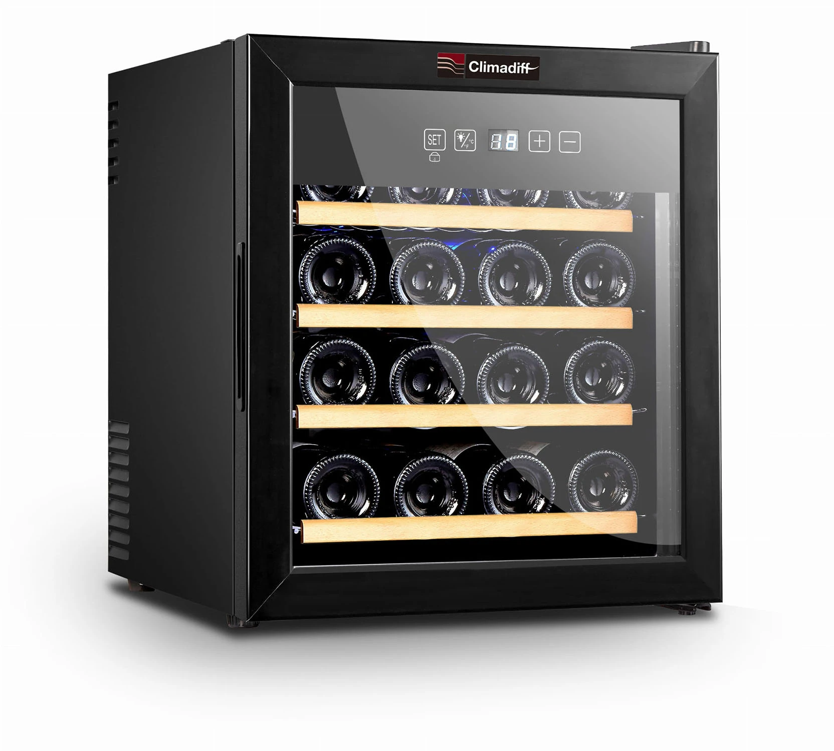 Model: CLS16H Rodzaj urządzenia: wolnostojąca Przeznaczenie: serwowanie Maksymalna liczba butelek (0,75l): 16 Strefy temperatur: 1 Zakres regulacji temperatury: 12° - 18°C Wyświetlacz cyfrowy temperatury: tak Oświetlenie wewnętrzne: LED białe Liczba półek: 4 metalowe z frontem drewnianym Wysuwane półki: nie Wymiary - wysokość (cm): 51,5 Wymiary - szerokość (cm): 43 Wymiary - głębokość (cm): 48,5 Drzwi: szklane podwójne Rama drzwi: czarna Zmiana kierunku otwierania drzwi: nie Regulowane nóżki: tak ( wys. 1,2 cm ) Kółka z tyłu: nie Obudowa: czarna Zamek: nie System antywibracyjny: tak Alarm: nie Cyfrowy wyświetlacz wilgotności: nie Filtr węglowy: nie System zimowy: nie Chłodzenie: termoelektryczne Waga netto: 14 kg Pobór prądu: 209 kWh / rok Klasa energetyczna: C Klasa klimatyczna: N Poziom hałasu: 33 dB Kod EAN 3595320105681